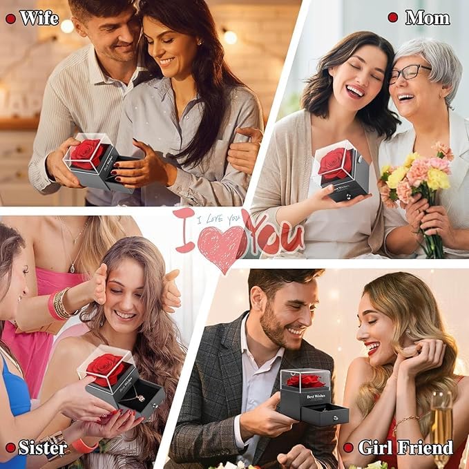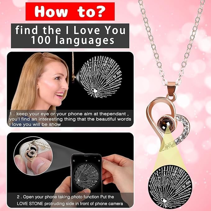 Eternal Rose Box: our eternal rose gift box looks like a blooming rose when opened, ingenious and beautiful. What a loving surprise! The metal handle is convenient to open. Your loved ones will be in a good mood whenever she looks at it! 100 Languages I Love You Necklace: This love necklace uses special engraving technology to engrave “I Love You” in 100 different languages into the love crystal stone. Bring the stone in the middle of the necklace close to your eyes or to your phone’s rear camera and then you can catch words. Perfect Gift for Her: It’s a great choice for her, girlfriend, wife, mom, grandma or your beloved ones as Valentine’s gifts, Mother’s Day gifts, Christmas gifts, Thanksgiving gifts, Birthday gifts, Wedding, Anniversary gifts, delivering your feeling – “I LOVE YOU”.