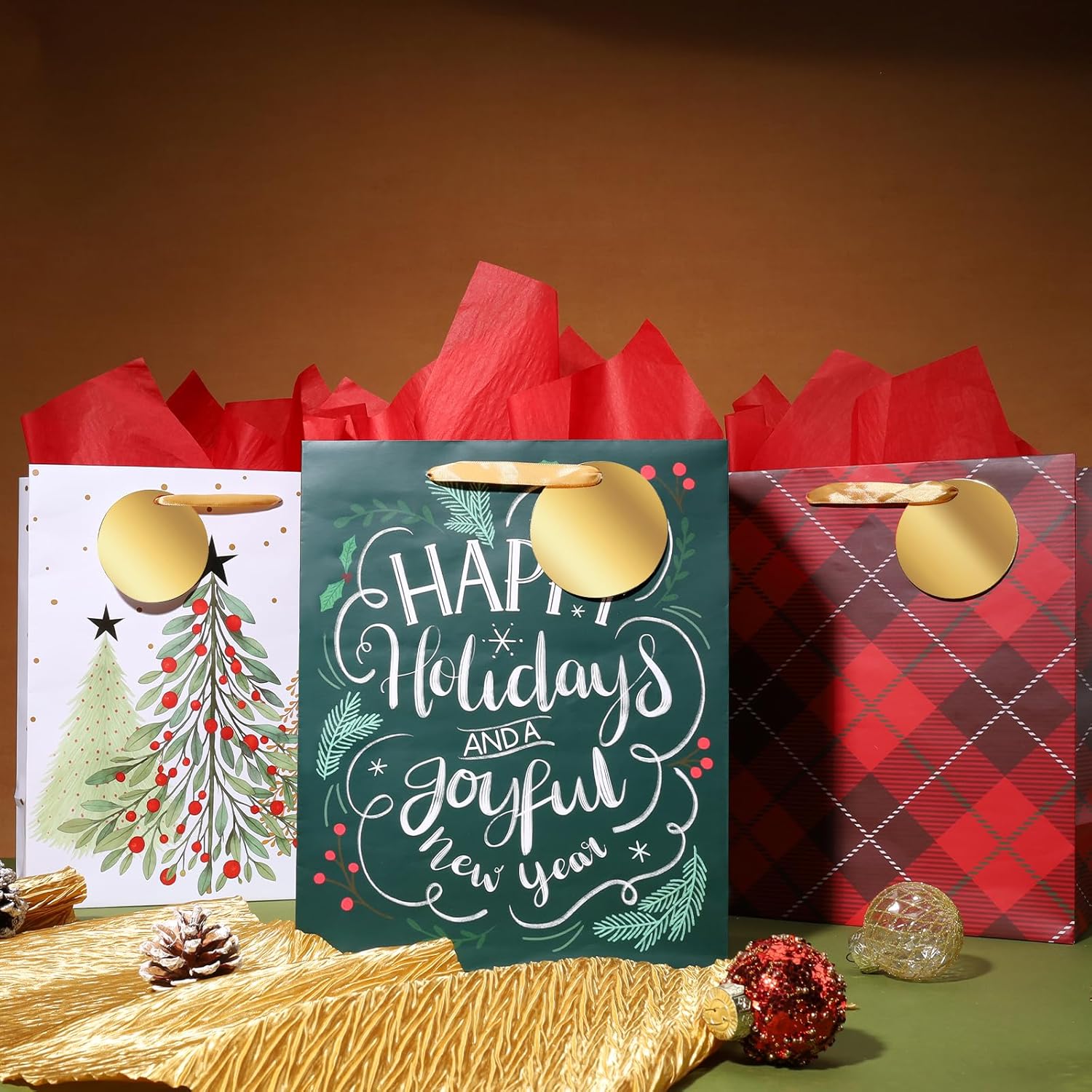 Complete Gift Set: Includes 3 gift bags (1 of each design), 9 sheets of matching red tissue paper, and 3 attached gift tags, everything you need for easy, elegant wrapping