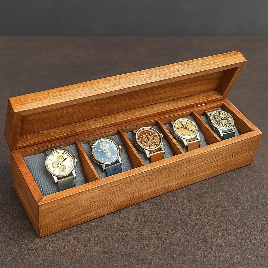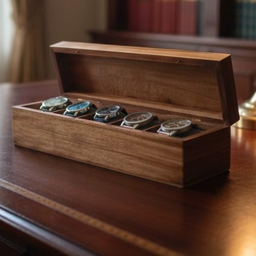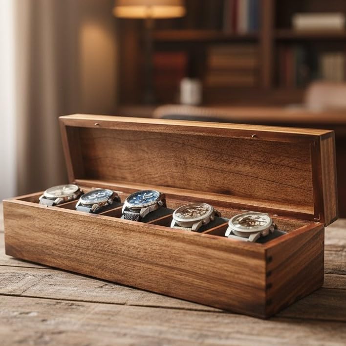 Organize and protect your cherished timepieces in style with this Premium Wooden Watch Box – the perfect blend of elegance, functionality, and craftsmanship. Handcrafted from high-quality natural wood, this sleek watch organizer is designed for watch enthusiasts who value both form and function. With five individual slots, each lined with plush, removable cushions, your watches stay securely in place, protected from dust, scratches, and damage. The solid hinged lid ensures easy access while the magnetic closure keeps the case tightly sealed when not in use. This timeless watch holder is more than just storage — it’s a beautiful display piece that enhances any room, desk, or dresser. Whether you’re showcasing luxury watches, everyday wear, or smartwatches, this box is a must-have for collectors and a perfect gift for birthdays, anniversaries, Father’s Day, or Christmas. Compact enough for travel and versatile enough for both men and women, this wooden watch box delivers sophistication and security in one elegant package.