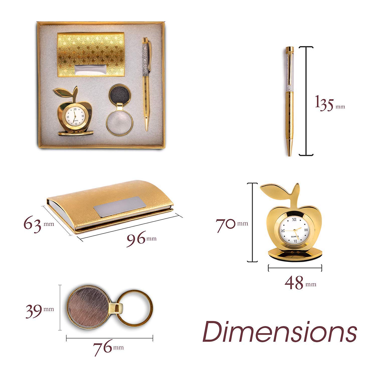 A gold-toned apple-shaped desk clock – a symbol of time spent together and cherished memoriesA metal pen with shimmer detailing – practical and polished for daily useA textured card holder – compact and functional for professional needsA round compact keyring– simple and elegant with a metallic finish