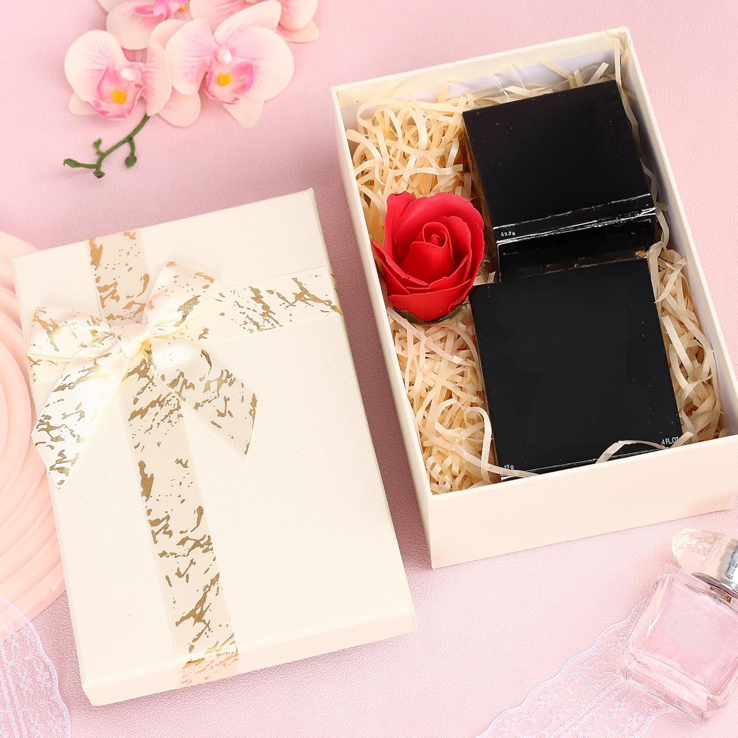 PACKAGE INCLUDES: 3Pc Set Gift Box. Material: Paper + Cardboard. (Please note that only the Gift Box is included; the other props are only for reference and are not included with the product.)