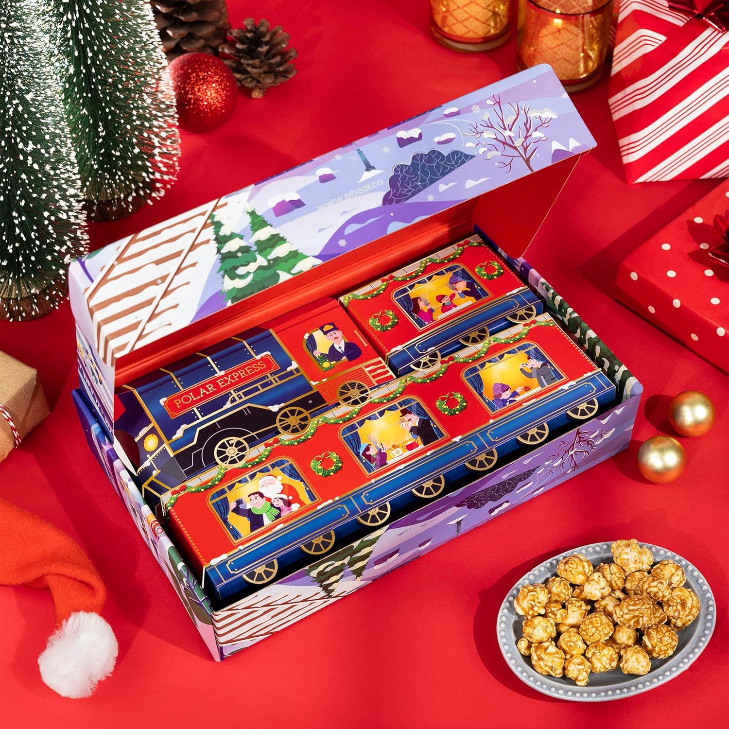 🎅 12+ Christmas Gifts : A beautifully curated Christmas hamper featuring festive candles, winter incense, gourmet treats, décor accessories, a train model, and an interactive greeting card.