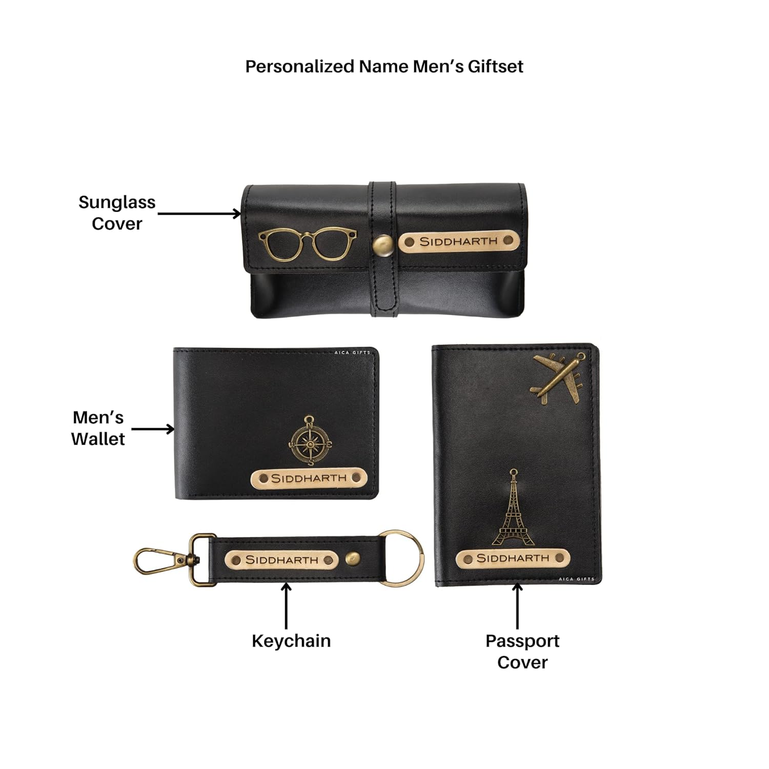 MENS 4PCS COMBO GIFT SET : This customised name mens combo giftset consist of Wallet + Sunglass Case + Passport Cover + Keychain . All these items comes in premium GIFT BOX. Perfect Gift for all occasions to your loved ones.