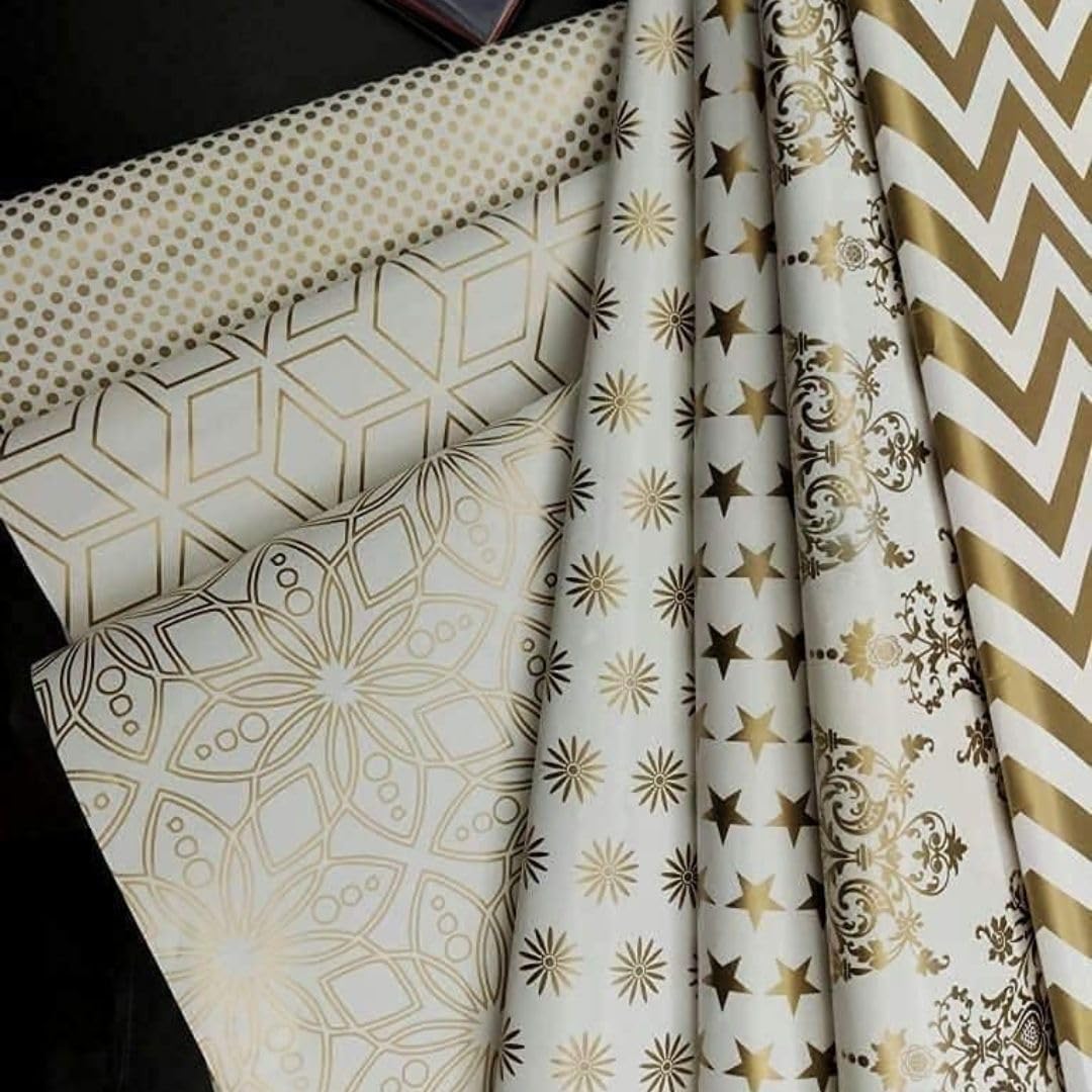 Package includes : 5 Pcs of White & Golden Premium Design Gift Wrapping Paper , Material : Paper , Colour : Golden and White , Size of the paper : 71 cm (Length) x 48 cm (Height)