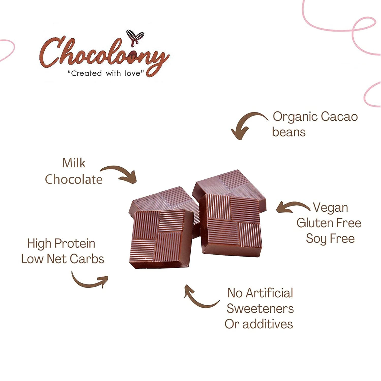 CHOCOLOONY milk chocolates are a perfect gift for everyone, the milk chocolates have unique secret recipes, driven by our unmatched standard for chocolate excellence. We start with the selection of the finest raw materials and the highest quality ingredients, as it is milk chocolate is very nutritious as well. These chocolates are beautifully wrapped inside a box which gives them a special and elegant feel. Humidity and temperature may cause the product to develop a whitish layer without affecting its fitness for consumption. Store in a cool, dry, hygienic place and away from direct sunlight. Celebrate the bond of love & togetherness with this beautiful gift set. 1) Finest professional quality Chocolates with the highest percentage of cocoa using premium cocoa beans. 2) Very smooth, Superior-tasting, superior flavor and texture and made with premium quality ingredients 3) Handmade and processed in small batches to ensure the highest standard quality 4) Trans-fat free and gluten-free 5) Ideal for any celebration, occasion birthday return gift chocolate hamper 6)Christmas Chocolate Gifts for Friends and Relative.