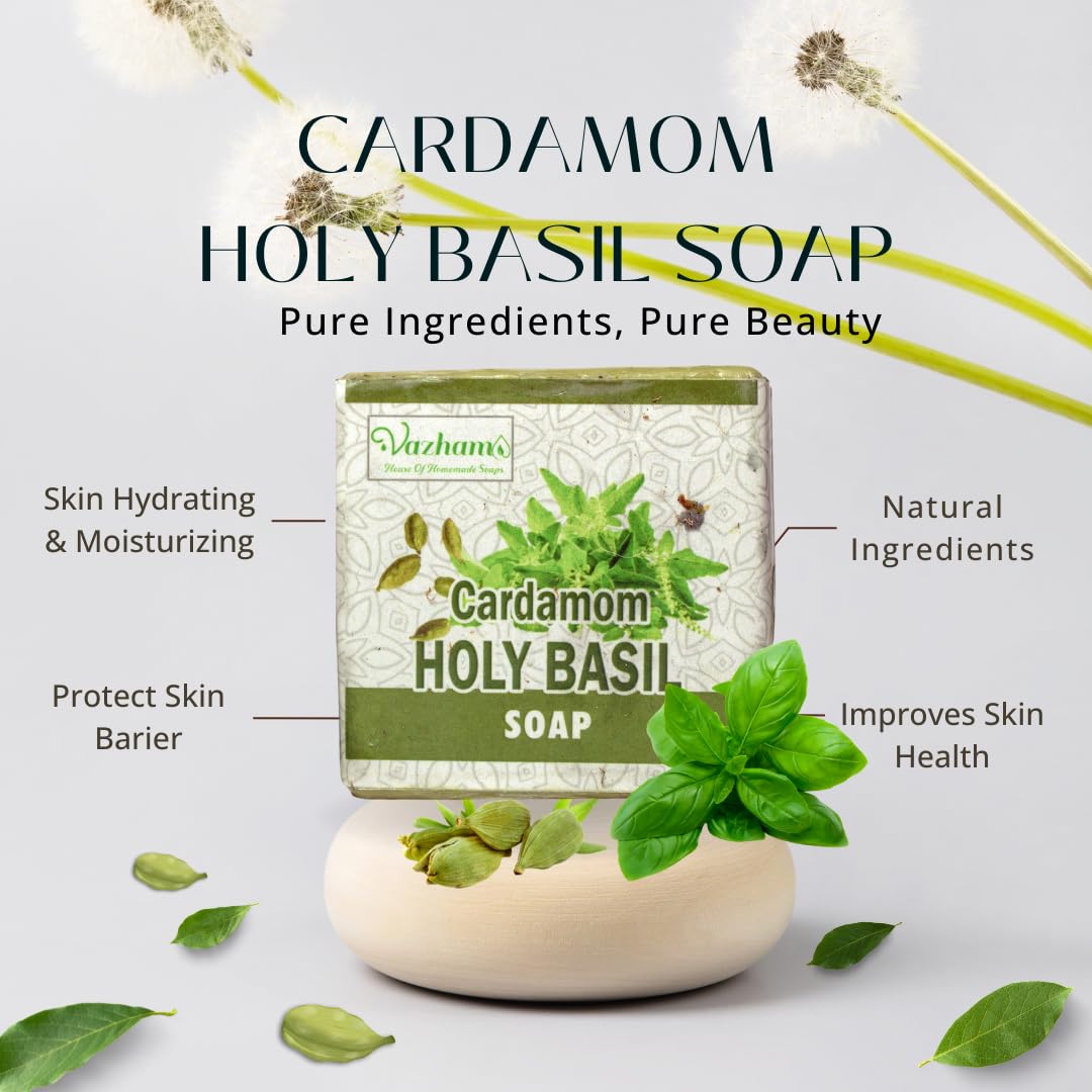 Discover the Vazham Pack of 5 Cold Pressed Natural Handmade Soaps, tailor-made for women craving luminous, nourished skin. Crafted with care, each 125g bar combines Lemongrass, Ylang Ylang, Holy Basil, Vetiver, and Harshingar for a harmonious blend of benefits. Illuminate your complexion with Lemongrass and Ylang Ylang, while Holy Basil gently removes tan, unveiling a natural glow. Enjoy the soft exfoliation of Lemongrass and Vetiver, leaving your skin supple and refreshed. Ylang Ylang and Harshingar provide deep hydration, while Holy Basil and Vetiver invigorate the senses. Guard against environmental damage with Lemongrass and Holy Basil antioxidants. Immerse yourself in aromatherapy bliss with each use. Handcrafted using the cold-pressed method, our soaps preserve nature’s purity for radiant results. Elevate your skincare regimen with Vazham