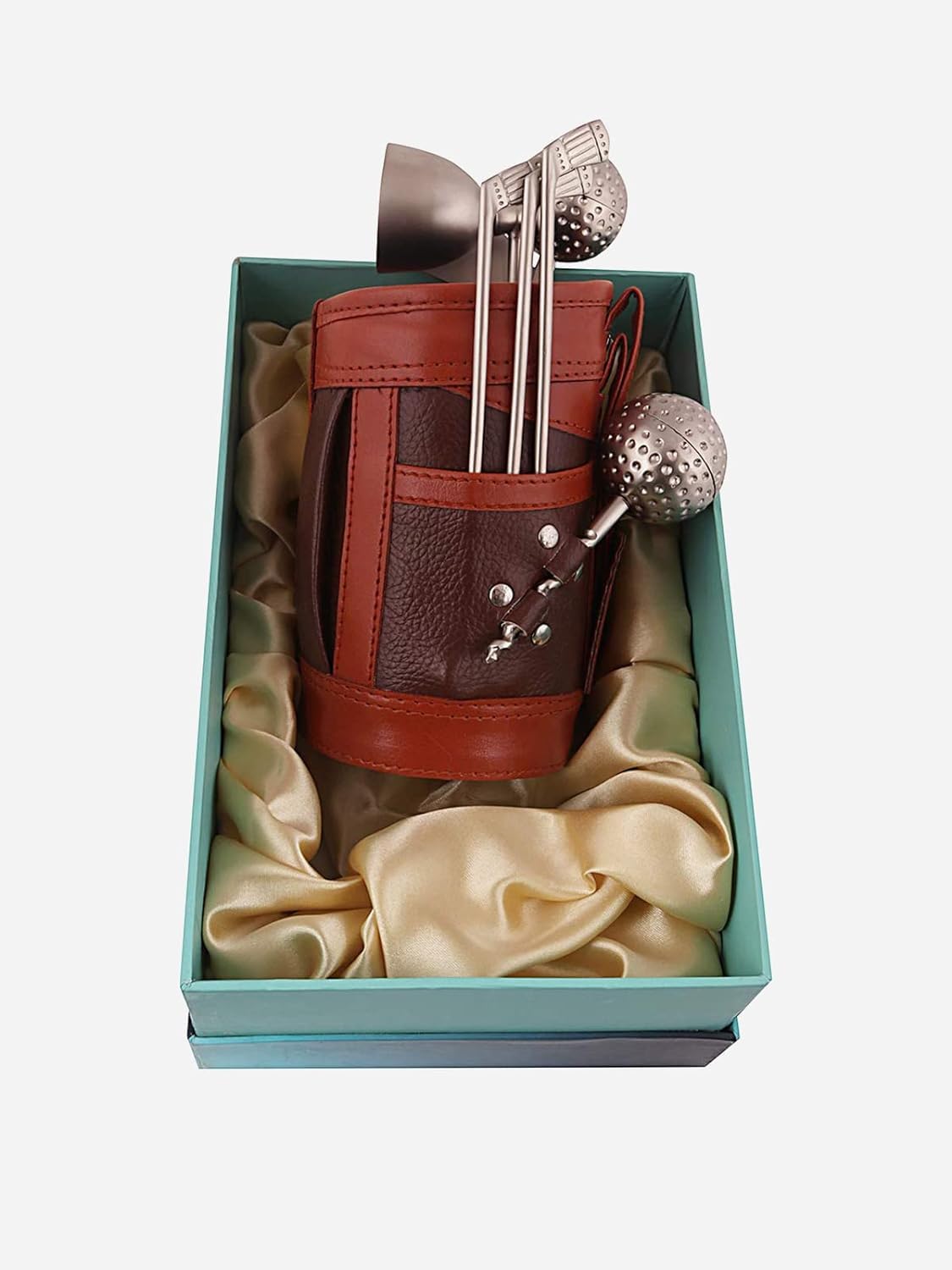 Unique Golf-Themed Design – Leather-textured golf bag case with stainless steel tools shaped like golf clubs and balls.