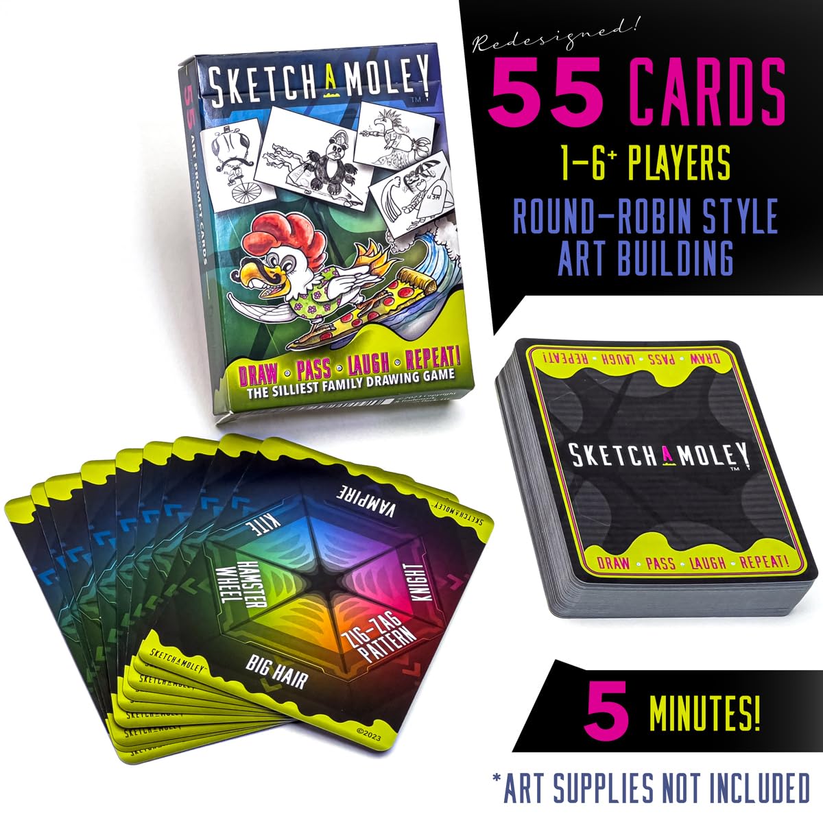 MULTIPLE WAYS TO PLAY! When playing round-robin with others, artists will ADD on to each piece of artwork as each artwork passes your tools. If playing alone, you can try to solo-sketch a ‘Super SketchaMoley’ doodle by including all 6 prompts from a single card to impress yourself!
