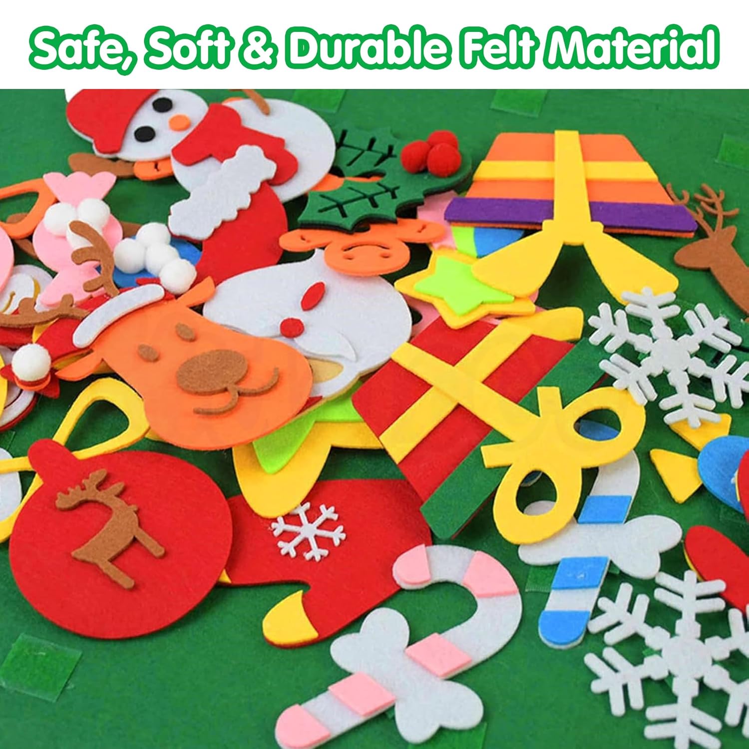 This set includes a 3.4ft premium felt Christmas tree and 40 detachable felt ornaments featuring stars, gifts, candy canes, snowflakes, stockings, Santa accessories, and more. The ornaments attach easily with strong felt fabric, allowing children to decorate, rearrange, and redesign