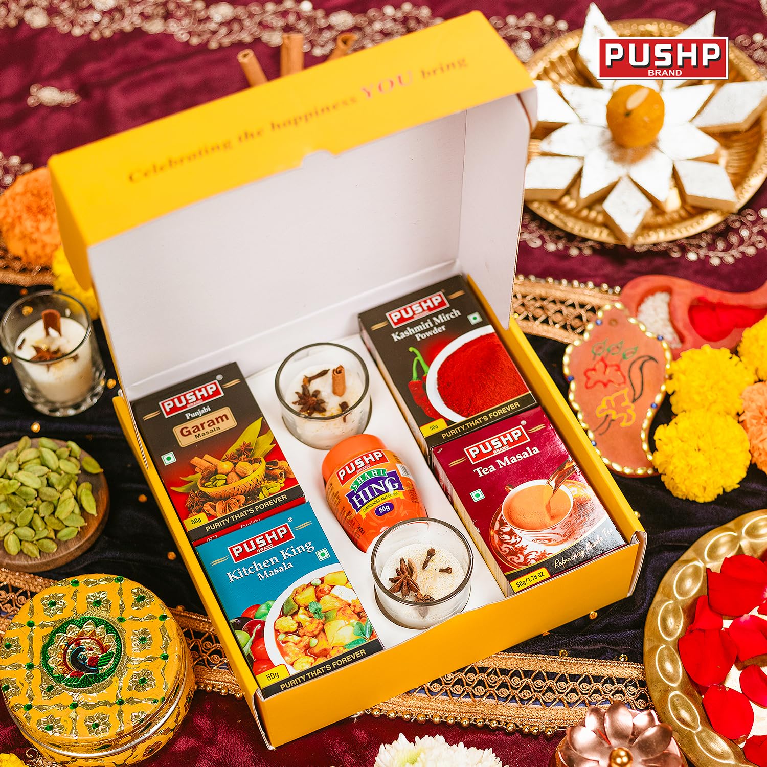 🔹 Premium Festive Gift Hamper :- A thoughtfully curated box with 9 authentic Indian spices and 2 aromatic scented candles, perfect for Diwali, Karwa Chauth, Bhai Dooj, weddings & housewarming parties.
