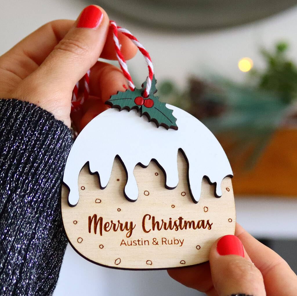 The ornament has the words “Merry Christmas” engraved into it and can be personalised with your own name(s). The pudding features a layer of white icing and a hand-painted sprig of holly. The decoration is finished with candy striped string so it can be hung beautifully from your Christmas tree. This makes a lovely gift and keepsake for friends and family.