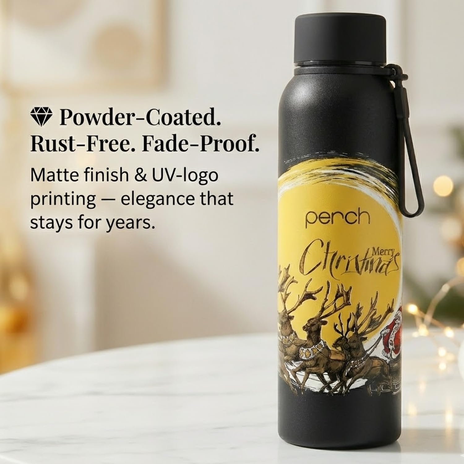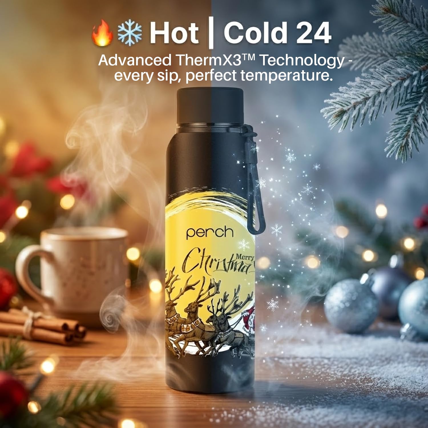 The Perch Zenith Bottle now in exclusive Christmas-themed designs blends quiet luxury with festive charm, making it an ideal premium gift for the holiday season. Built with advanced ThermX3 Vacuum Technology and 304-grade stainless steel, it delivers superior temperature retention and keeps every sip pure and refreshing. Designed for daily use or holiday travel, Zenith offers a high-capacity yet portable build with an easy-to-carry silicone strap and soft base pad. Its ISI-certified, food-safe, corrosion-resistant, and easy-to-clean construction ensures reliability and safety.