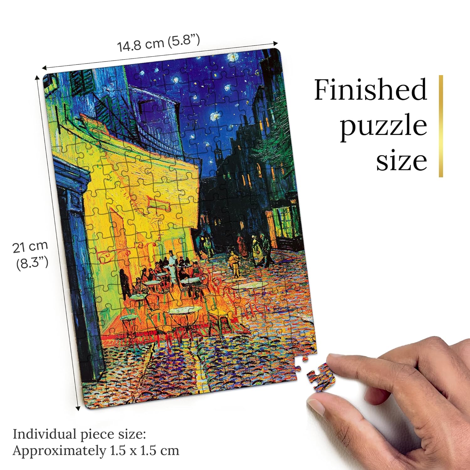 Premium Art Puzzle: Features Van Gogh’s iconic “Café Terrace at Night” in vivid, high-quality wooden pieces for an elegant and immersive puzzle experience.