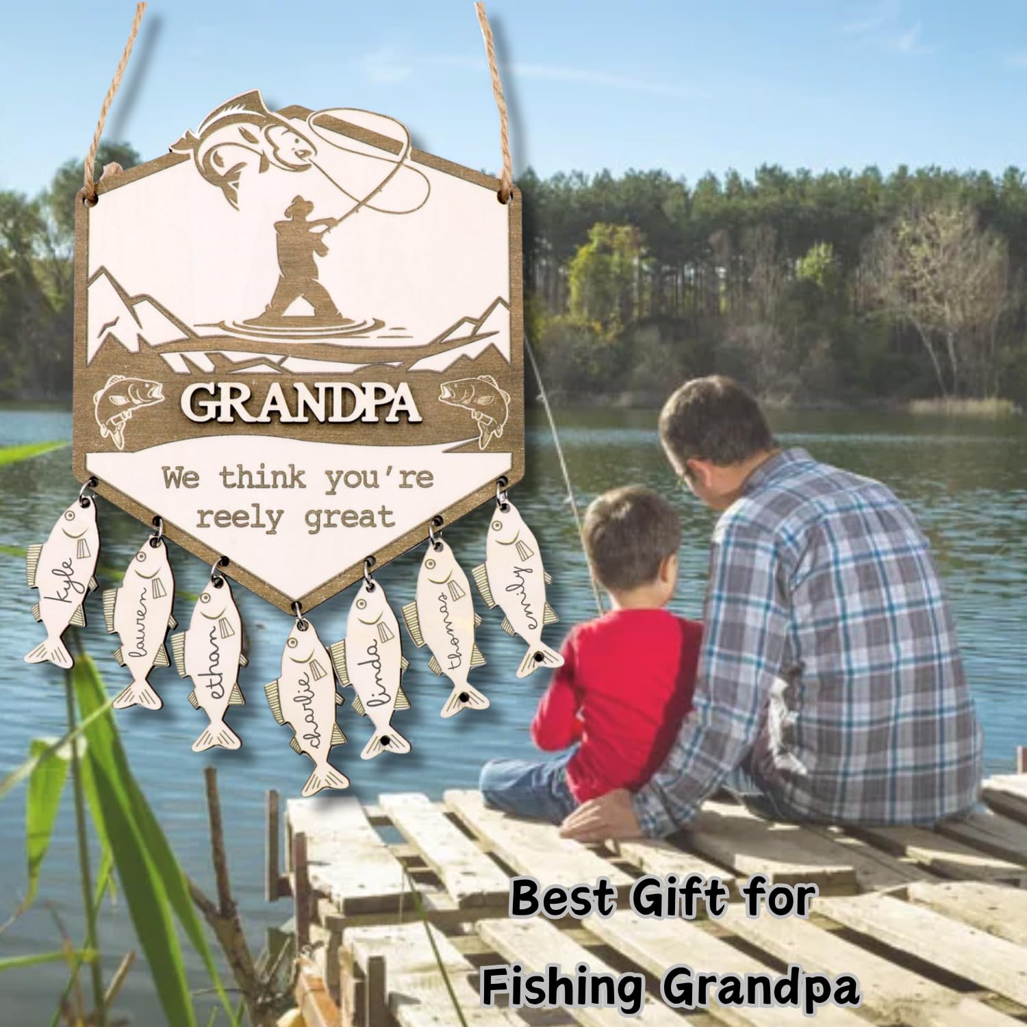Fishing Gifts for Grandpa,Fathers Day Fishing Fifts for Grandpa,Grandpa Fishing Gifts for Birthdday, Grandparents Day, Christmas, Retirement, Fishing Themed Personalized Hanging Wooden Sign