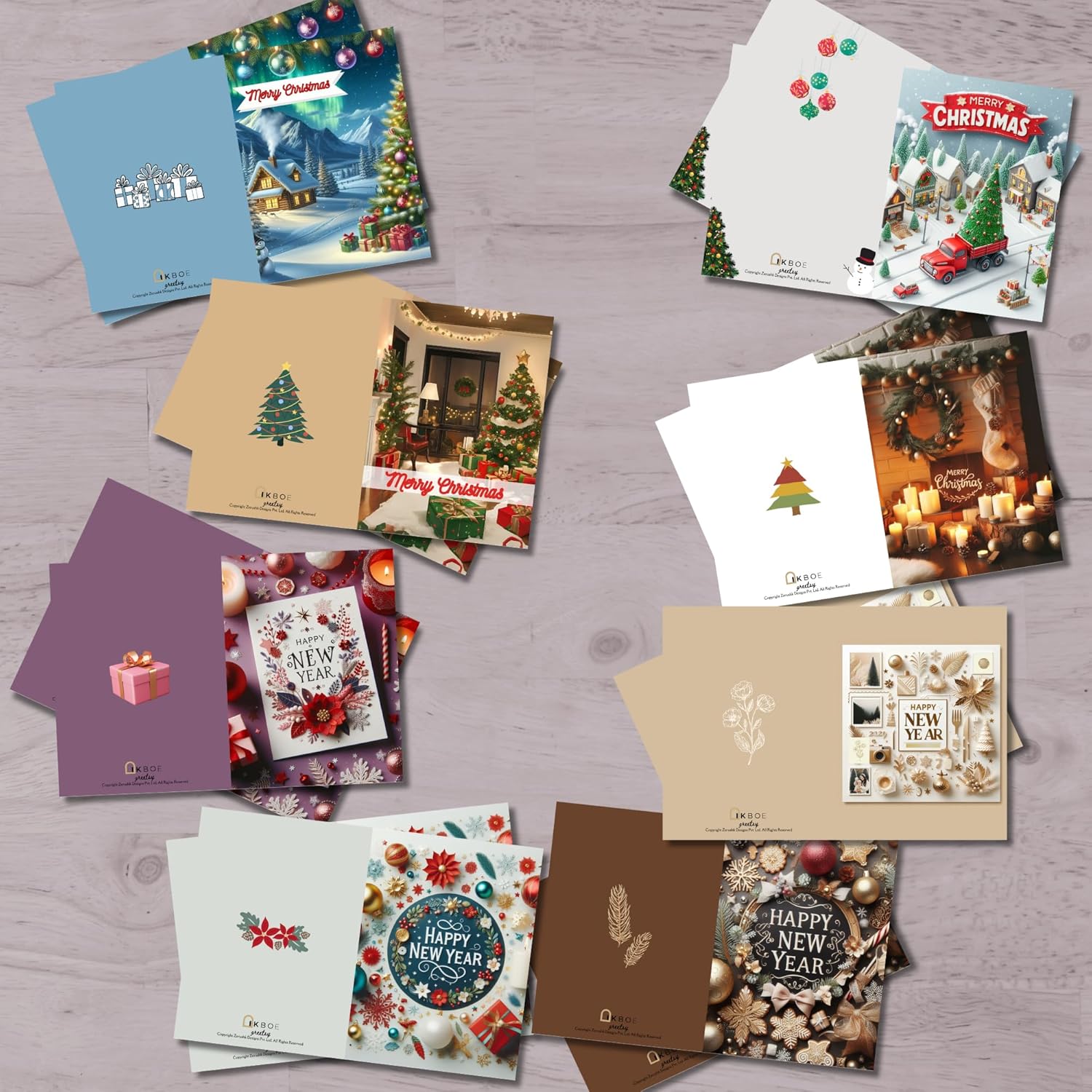 Creative Design: The Xmas cards feature a unique colourful and warm design that captures the spirit of Christmas, such as Xmas tree, snow, snowflakes, reindeer, Santa Claus, bells, candles, and more. Each New Year card features a festive and fun design that celebrates the New Year, such as flowers, balloons, food, champagne, clocks, and more. The designs are finely detailed and colourful.