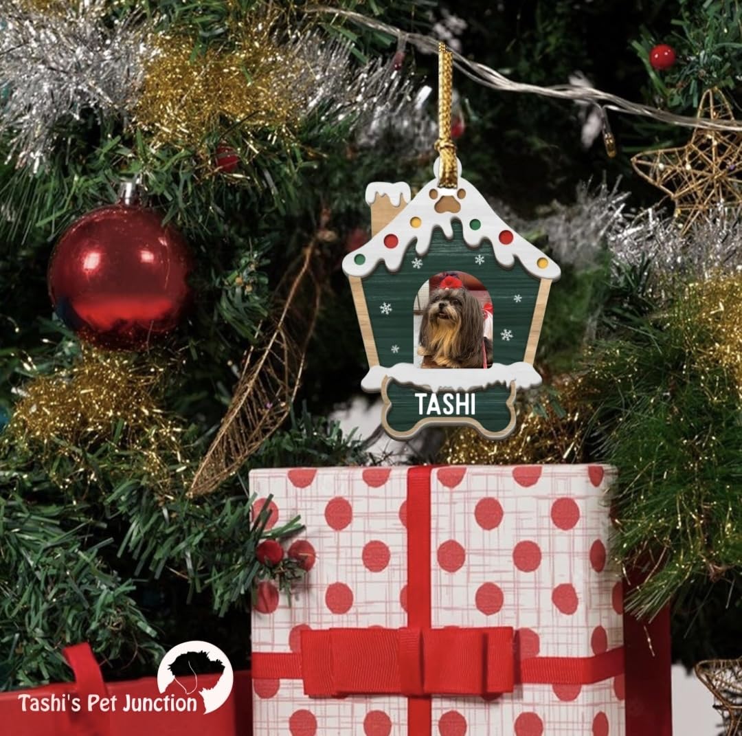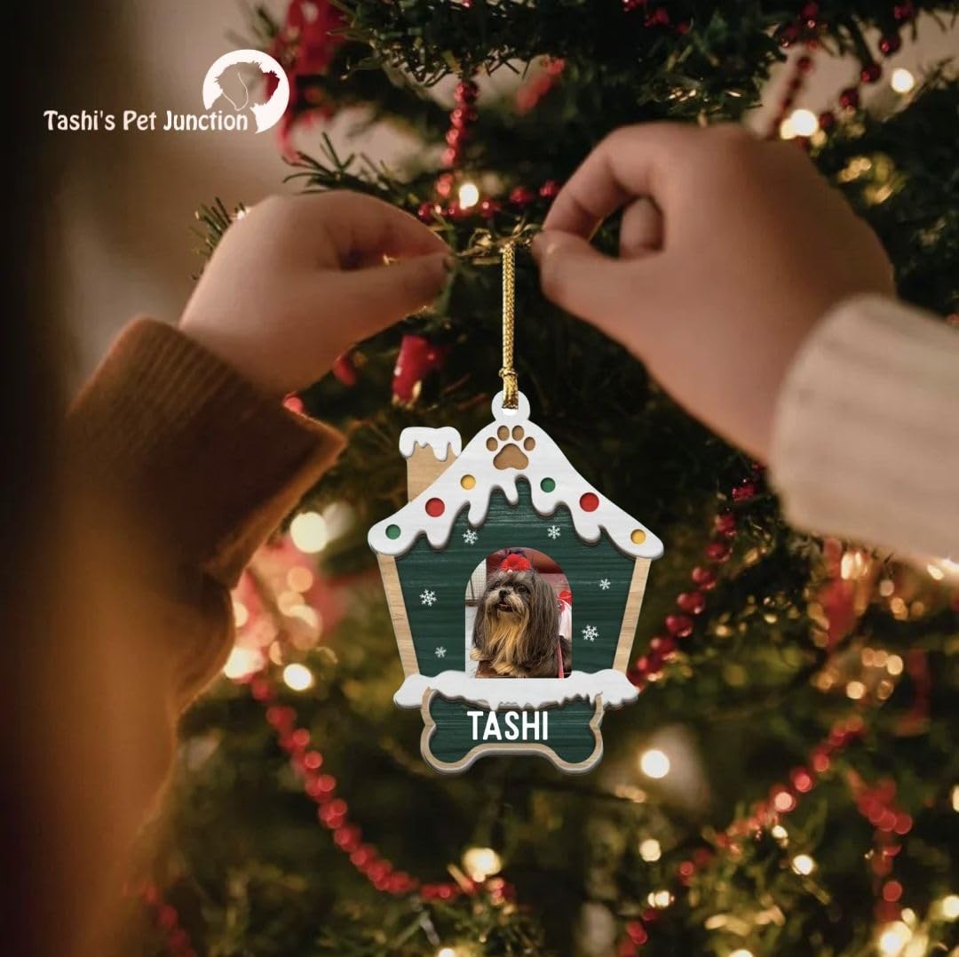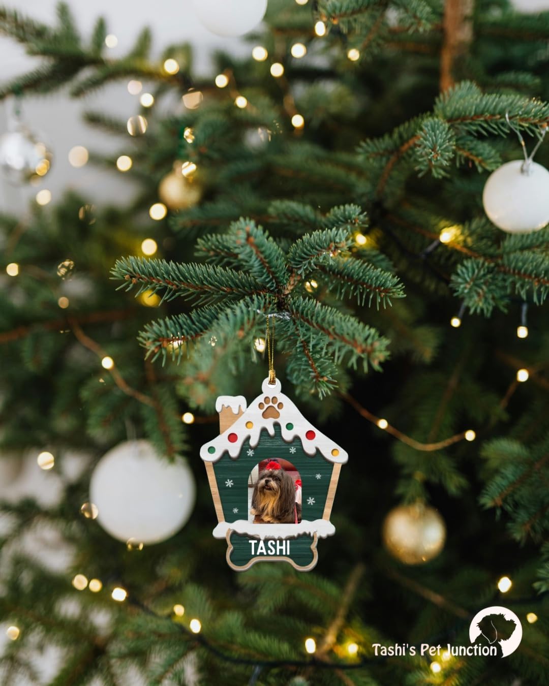 This epoxy resin personalized Christmas ornament is the perfect holiday treasure for pet dog and cat lovers who want to celebrate their furry companions during the festive season. Designed in a charming green wooden-style dog house, the ornament features a snowy white roof topped with a tiny paw icon, adding a delightful winter touch. At the center, you can display your pet’s photo, while the bottom showcases your pet’s name, making it a truly custom keepsake. Mini snowflakes on both sides of the photo enhance the holiday charm. Crafted from lightweight yet durable resin, it hangs easily on any Christmas tree without weighing down branches. Ideal for dog moms, cat dads, pet parents, and anyone searching for custom pet ornaments, personalized Christmas decorations, or unique holiday gifts.