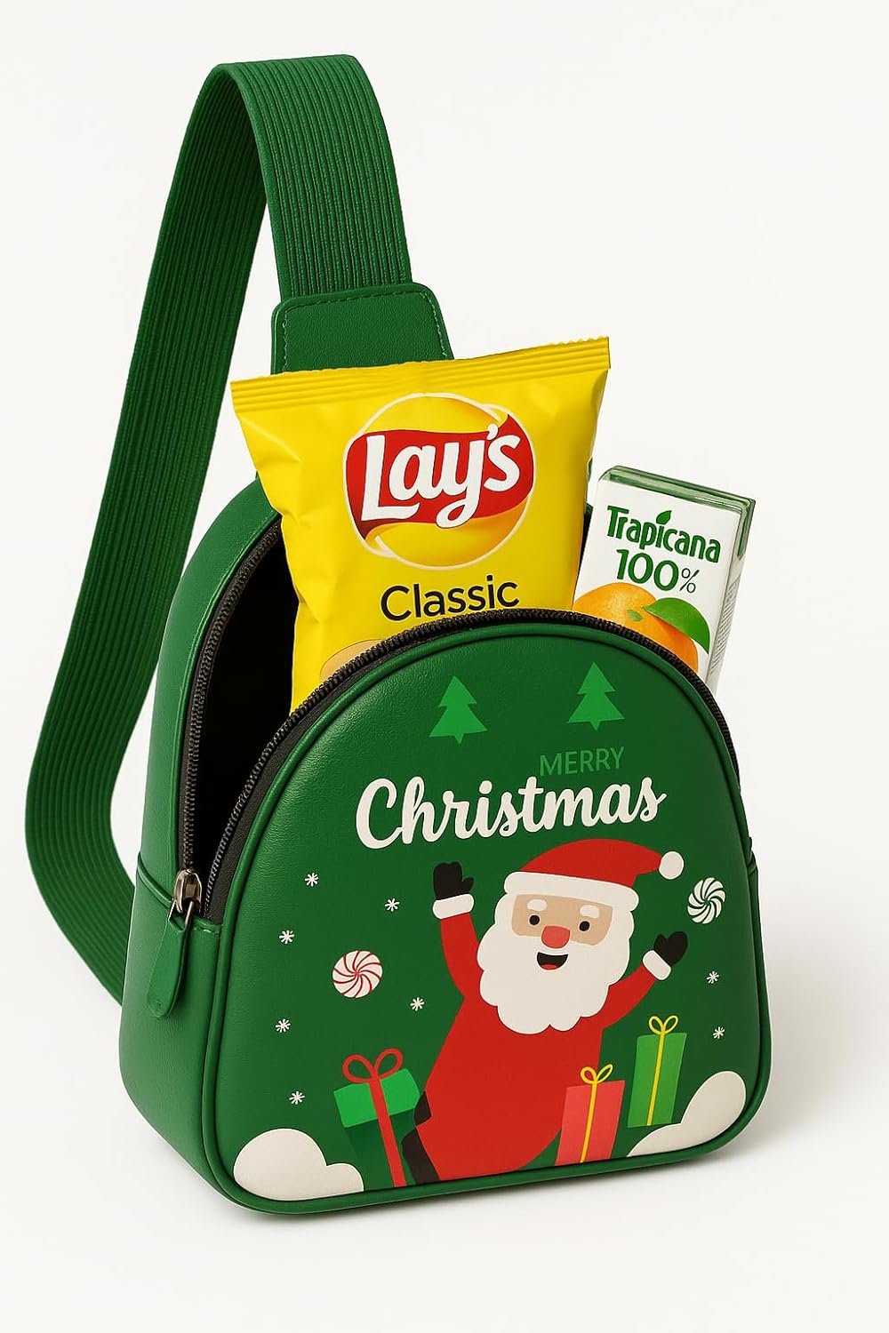 Spread holiday cheer with this adorable Christmas-themed sling bag from Glitreeprops! Perfect for kids, this mini crossbody backpack features a festive red design adorned with a cheerful Santa Claus, delicate snowflakes, Christmas trees, and wrapped presents. The compact size (17 x 13 x 6.5 cm) is ideal for carrying small holiday essentials or treats. The adjustable red strap ensures a comfortable fit for children, while the durable construction makes it suitable for seasonal activities. This charming bag adds a merry touch to any Christmas outfit and works wonderfully for holiday parties, winter outings, or gift-giving occasions. The vibrant colours and playful holiday motifs create a delightful accessory that captures the magic of the season. Its practical single-strap design makes it easy for children to wear and access their belongings. Whether used for carrying small toys, snacks, or holiday treasures, this festive sling bag brings joy and functionality together in a child-friendly package.