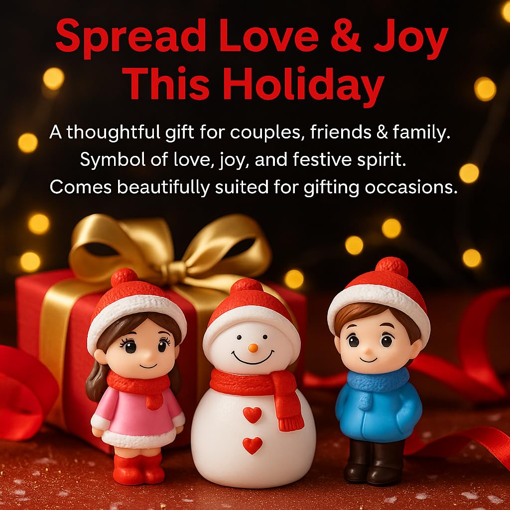 This handcrafted trio includes a smiling snowman adorned with heart details and two adorable winter characters — a boy in a blue scarf and a girl in a pink coat — ready to melt hearts this season.