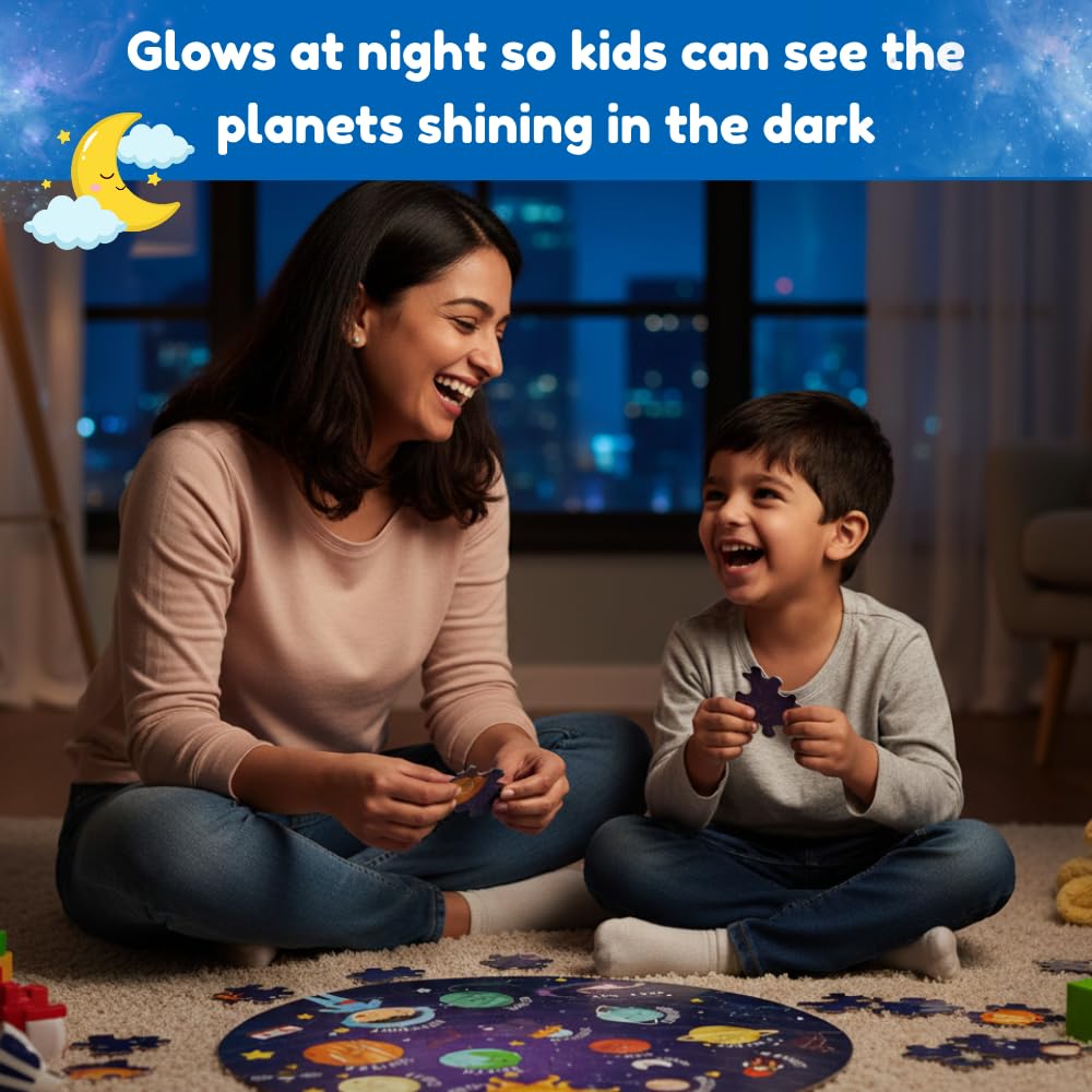 Jigsaw puzzle for kidsIt Glows in the dark making it even more exciting for kidsPuzzles are a crucial part of child’s developmentPuzzles help develop patience, logical thinking, fine motor skills, memory and hand eye coordinationA good option for return gift for kids birthday party. Throw a space theme birthday and this is the perfect return gifts for kids