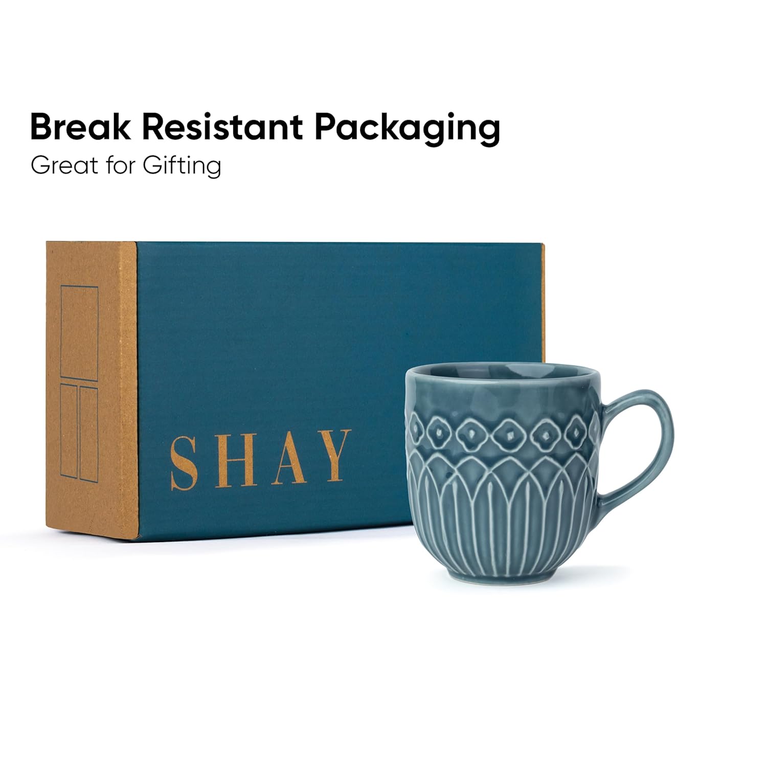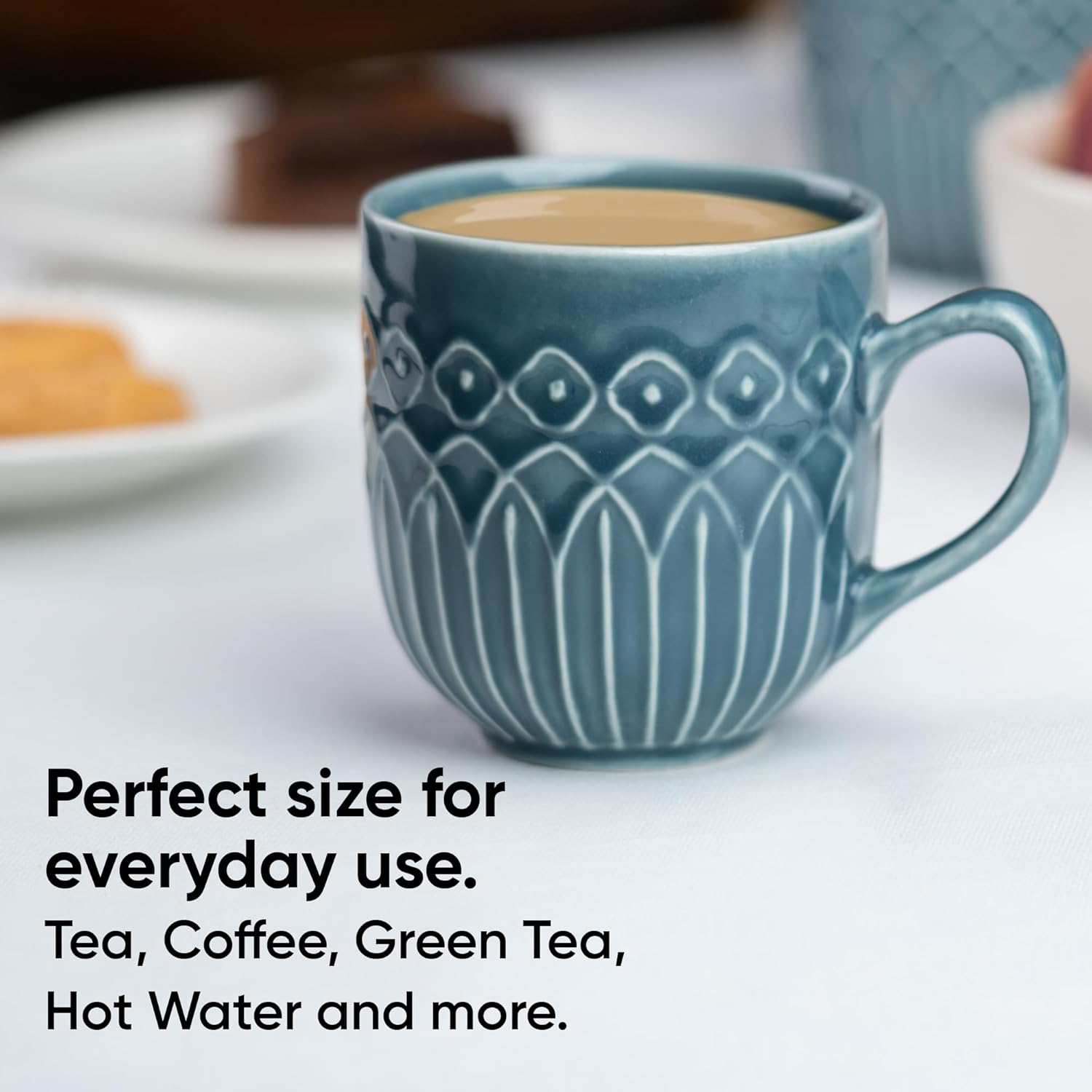 Colour – Blue Grey Glaze on Carving Mug | Finish – Glossy | Elegant, Unique Modern Design