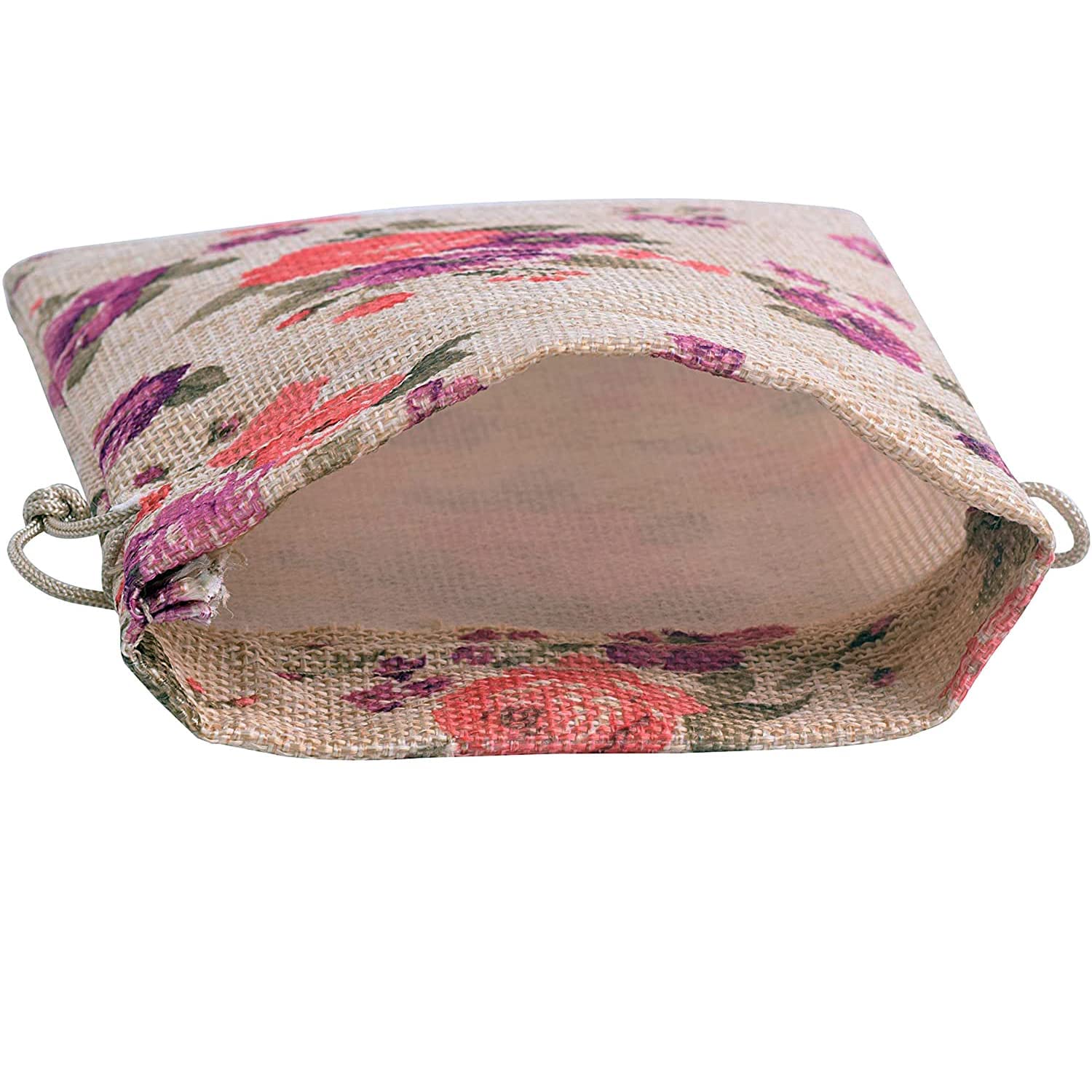 Elegant Purple Floral Design – Beautiful linen jute pouches featuring a stylish purple floral pattern to enhance the look of your gifts and packaging.