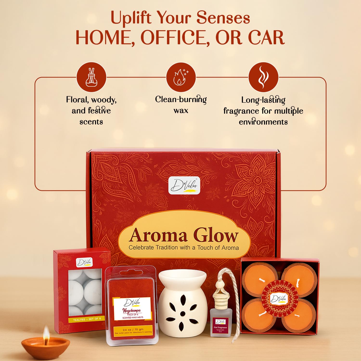 Complete Christmas Gift Set – Includes 1 Ceramic Burner, 6 Wax Melts, 6 Unscented Tealights, 4 Scented Diyas, and 1 Car Fragrance Diffuser