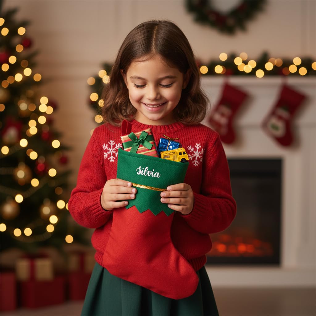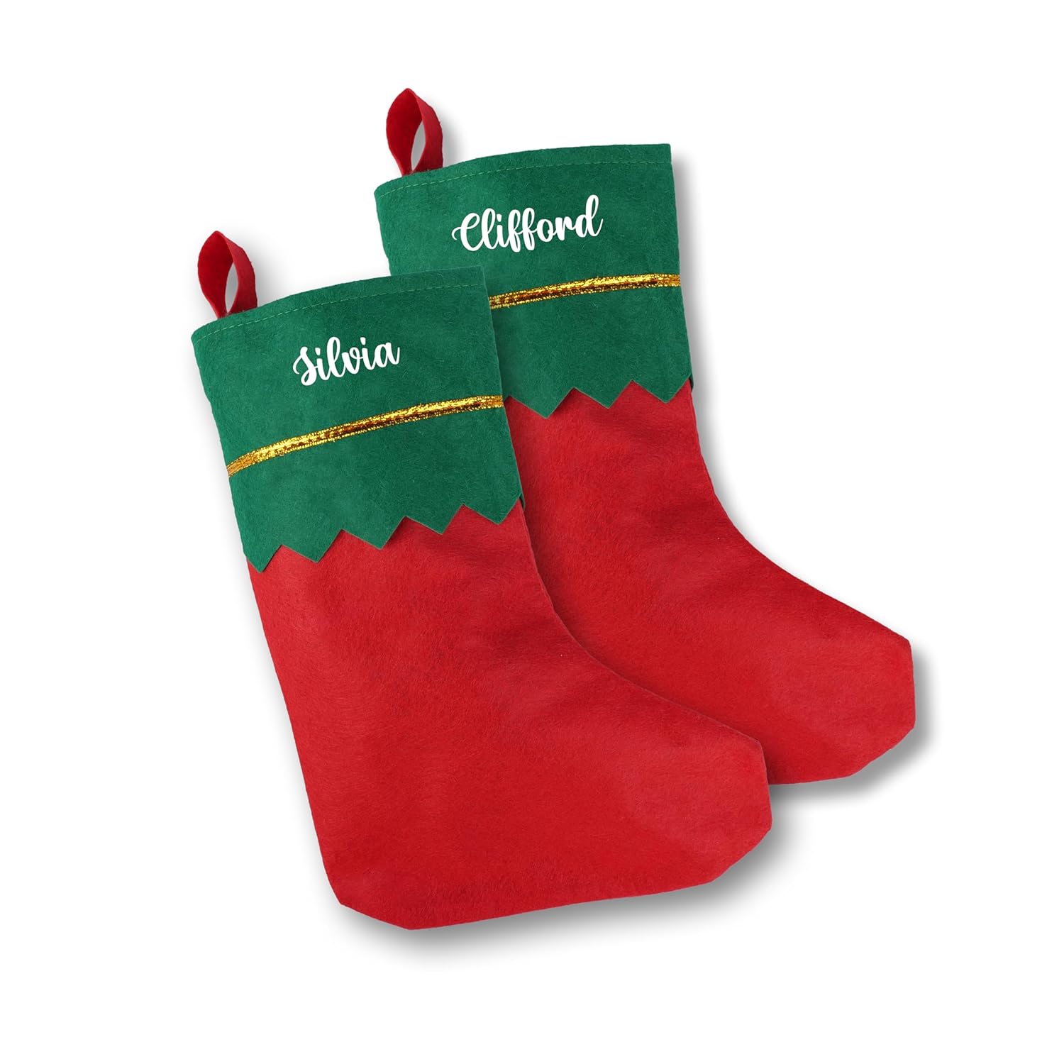 These charming personalised Christmas stockings bring festive cheer and a special touch to your holiday décor. Featuring a classic design with vibrant red and green colours, each stocking showcases a distinctive zig-zag pattern where the two colours meet, creating an eye-catching elf-inspired look. The elegant gold trim adds a touch of sparkle and sophistication to these holiday essentials. What makes these stockings truly special is the personalisation option, with names beautifully displayed in white script lettering on the green portion of each stocking. The convenient red hanging loop makes it easy to display them on your mantelpiece, staircase, or anywhere you want to add festive spirit. Perfect for the entire family, these stockings create a cohesive and coordinated Christmas display whilst giving each family member their own special place for Father Christmas to leave treats and surprises. The generous size provides ample room for filling with sweets, small gifts, and holiday treasures. These personalised stockings make wonderful keepsakes that can be treasured and reused year after year, becoming a beloved part of your family’s Christmas traditions.