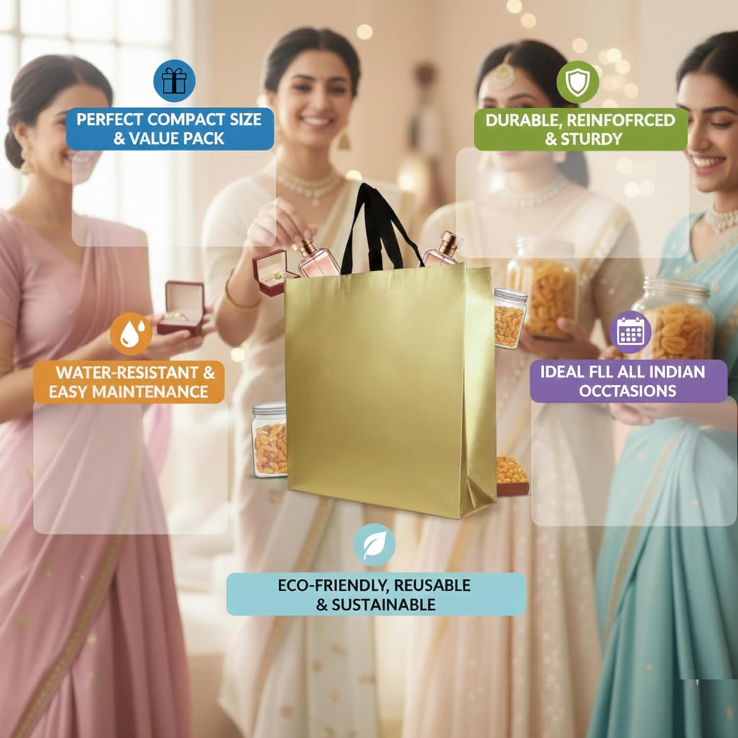 Elevate Your Gifting with the Elegance of a Metallic Bag. Make every celebration unforgettable with our ekysa dekor Premium Gift Bags. Designed for those who appreciate the finer details, these bags feature a stunning Foil pattern set against a shimmering metallic backdrop. Whether you are hosting a grand wedding or a small festive gathering, these bags add a touch of royal luxury to your gifts. Wedding Favours: Jewellery boxes, sarees, and silver coins. Festive Hampers: Dry fruits, chocolates, and sweets. Party Giveaways: Cosmetics, perfumes, and return gifts for Baby Showers or Kitty Parties. Durability Meets Sophistication. Forget flimsy paper bags that tear under pressure. Our bags are crafted from high-quality, thick non-woven fabric laminated with an advanced laser coating. The reinforced handles ensure you can carry heavier items like MDF boxes or glass jars with total peace of mind. Plus, the water-resistant surface means your gifts stay protected from unexpected splashes or light rain. Sustainable & Eco-Conscious Choice Celebrate responsibly! Made from upgraded, eco-friendly, non-poisonous materials, our bags are designed to be reused time and time again. Unlike disposable packaging, these long-lasting fabric bags serve as a functional gift themselves, as guests can reuse them for shopping or storage, reducing environmental waste. A Bag for Every Indian Celebration from the vibrant colors of Holi and Mehendi to the sacred moments of Shagun and Diwali, these bags are versatile enough for all traditional Indian festivities including: Weddings: Haldi, Sangeet, and Reception Return Gifts. Festivals: Rakhi, Karwa Chauth, Christmas, and Eid. Corporate: Sophisticated gifting for clients and employees. Product Specifications: Material: Laminated Non-Woven Fabric (Glossy Finish) Features: Water-Resistant, Reinforced Handles, Eco-Friendly
