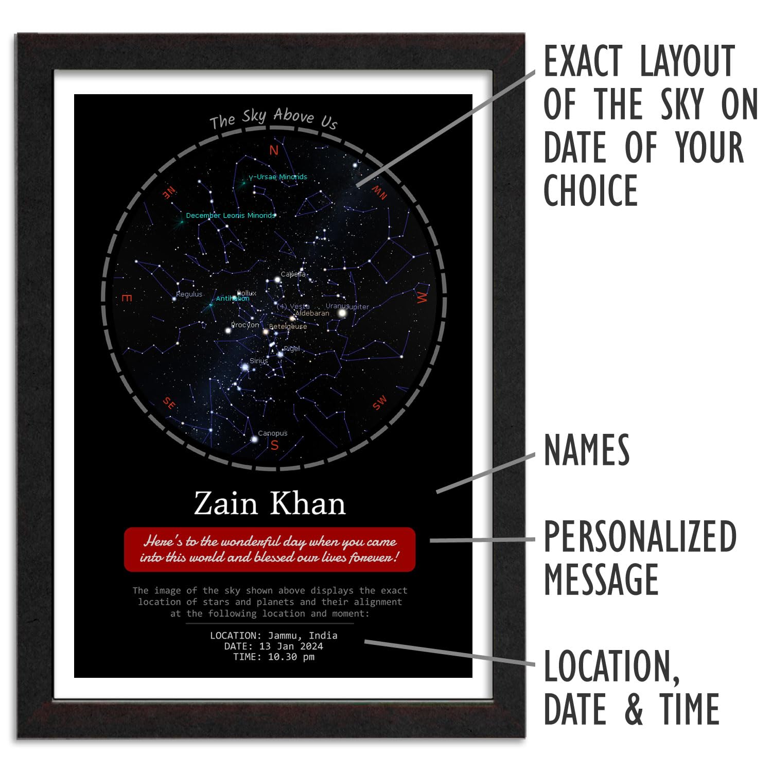 STARS ABOVE US: The framed print includes a print of the exact layout of the stars, planets and the sky on the date and time of your choice