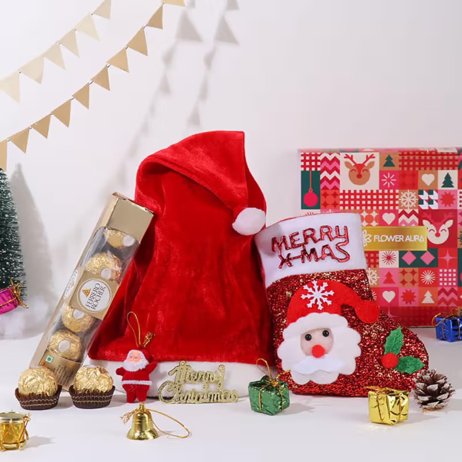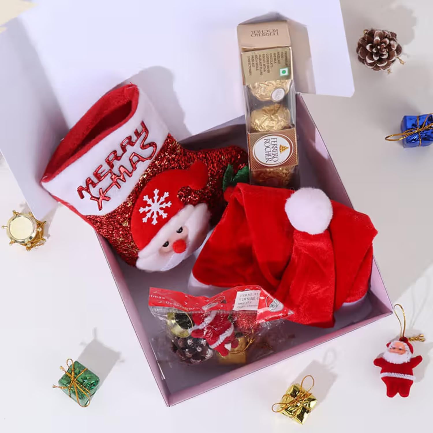 Complete Christmas Hamper: Includes a Merry Christmas Sock, festive Santa Cap, Choco Balls Pack, and charming Decor Items, all neatly packaged in a premium gift box.