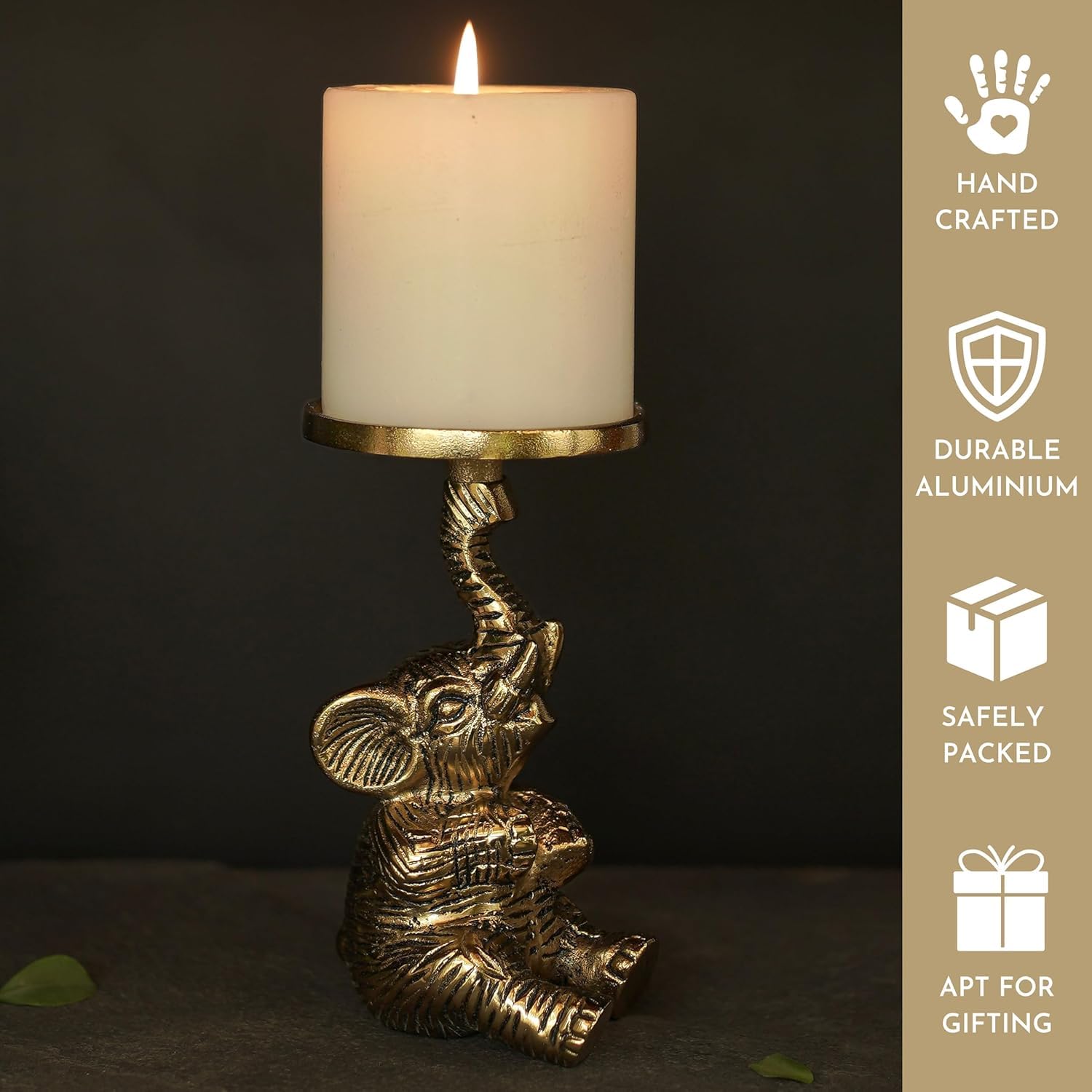 Elegant Set of 2 Elephant Candle Holders: Enhance your decor with this exquisite pair of handcrafted elephant statues. Each holder features the elephant’s trunk elegantly curved upward to form a sturdy base for a pillar candle, adding a touch of artistic charm and a warm, ambient glow to any room. (Candles are for display and are not included).