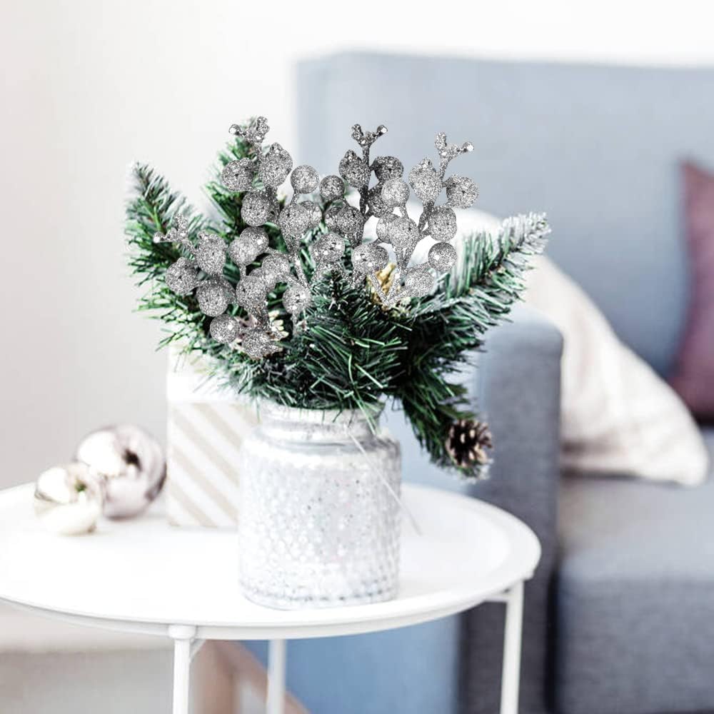 Glitter Christmas Berries: Artificial silver/red/gold berry stems are covered with nice glitter. Under the light, silver/red/gold berries for christmas tree full of glitter beauty, vibrant berry stems, adding vitality to the festival, it is Christmas picks decorations.
