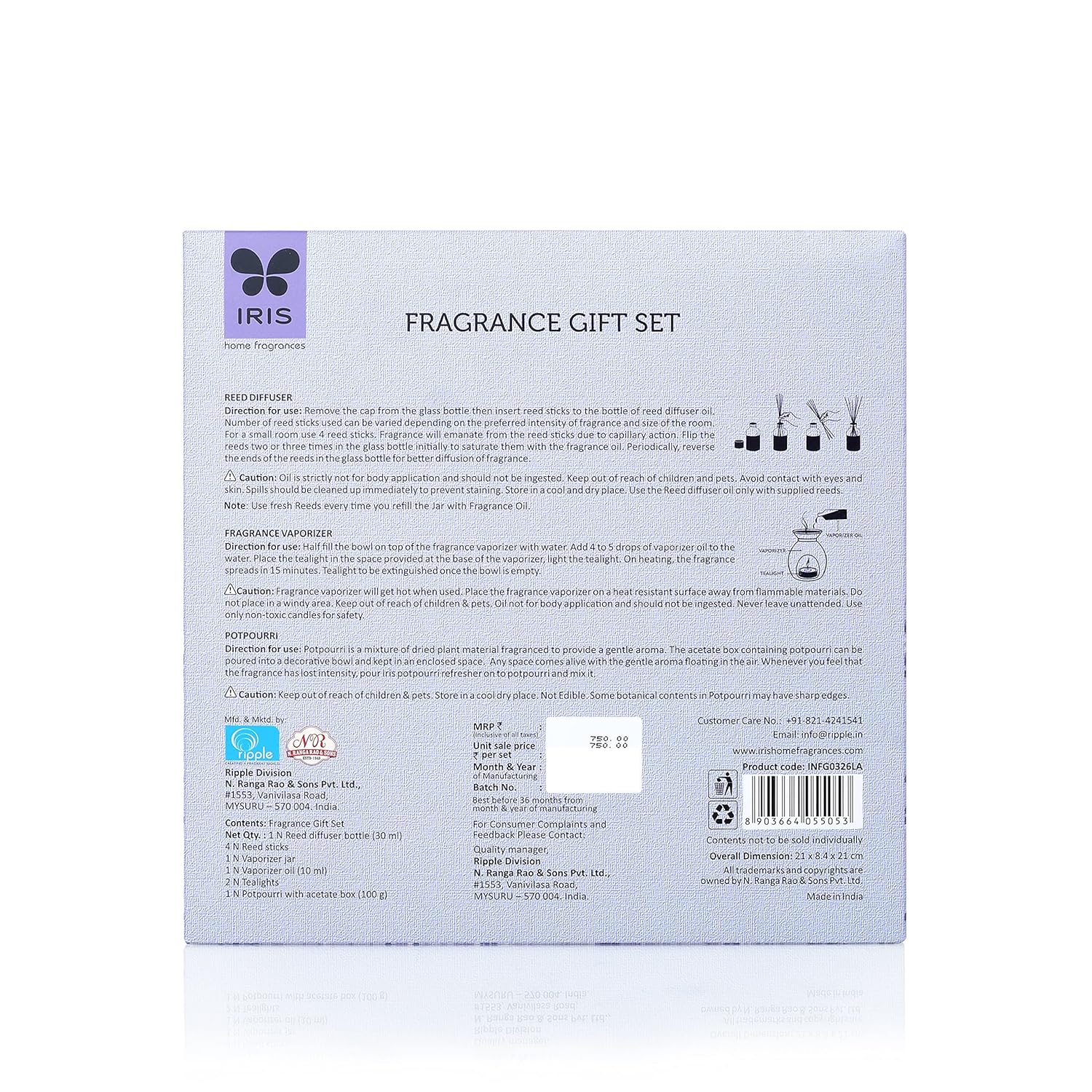 Multi-sensorial experience: A beautifully fragrant creation for your home, the IRIS Lavender Fragrance Giftset has the potential to enliven your interiors, irrespective of the occasion, mood, or place.