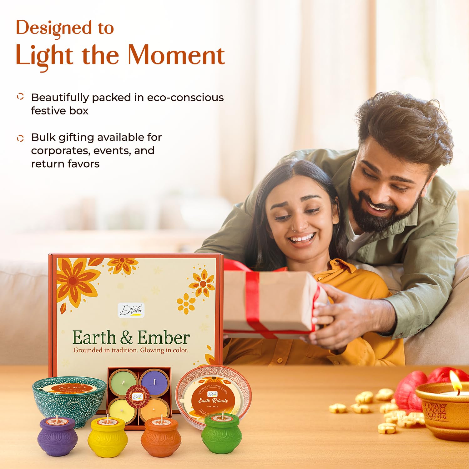 Celebrate this Christmas with Earth & Ember — a vibrant gift set crafted by D’Velas™ to light your spaces and uplift your spirit. This hamper combines traditional design with premium fragrances, featuring: 2 Scented Bandhani Bowl Candle 4 Handpainted Scented Matki Diyas 4 Scented colour Diya Each piece is hand-poured using clean-burning wax and enriched with long-lasting aroma oils, celebrating Indian artistry in a modern, festive form. Whether you’re adorning your home, gifting clients, or sending warm wishes, Earth & Ember is a radiant expression of tradition. Packaged elegantly, it’s ideal for Christmas gifting, weddings, return gifts, pooja thalis, and housewarming favors. Crafted in India, with heart.