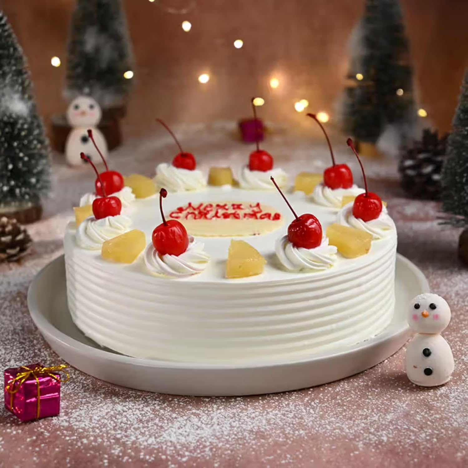 Celebrate the joyous season of Christmas with the FlowerAura Christmas Special Fresh Yummy Merry Christmas Cherry Pineapple Cake. Perfectly crafted to spread festive cheer, this delightful cake features a rich blend of juicy cherries and sweet pineapples, creating a burst of flavor that will brighten up any Christmas celebration. Whether you’re sharing it with family, friends, or colleagues, this cake is a heartwarming treat that adds a sweet touch to the holiday spirit. A thoughtful and delicious gift that brings smiles to everyone!