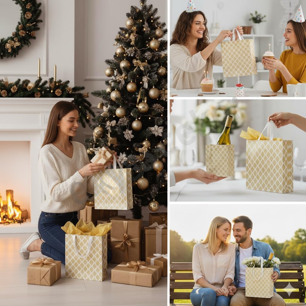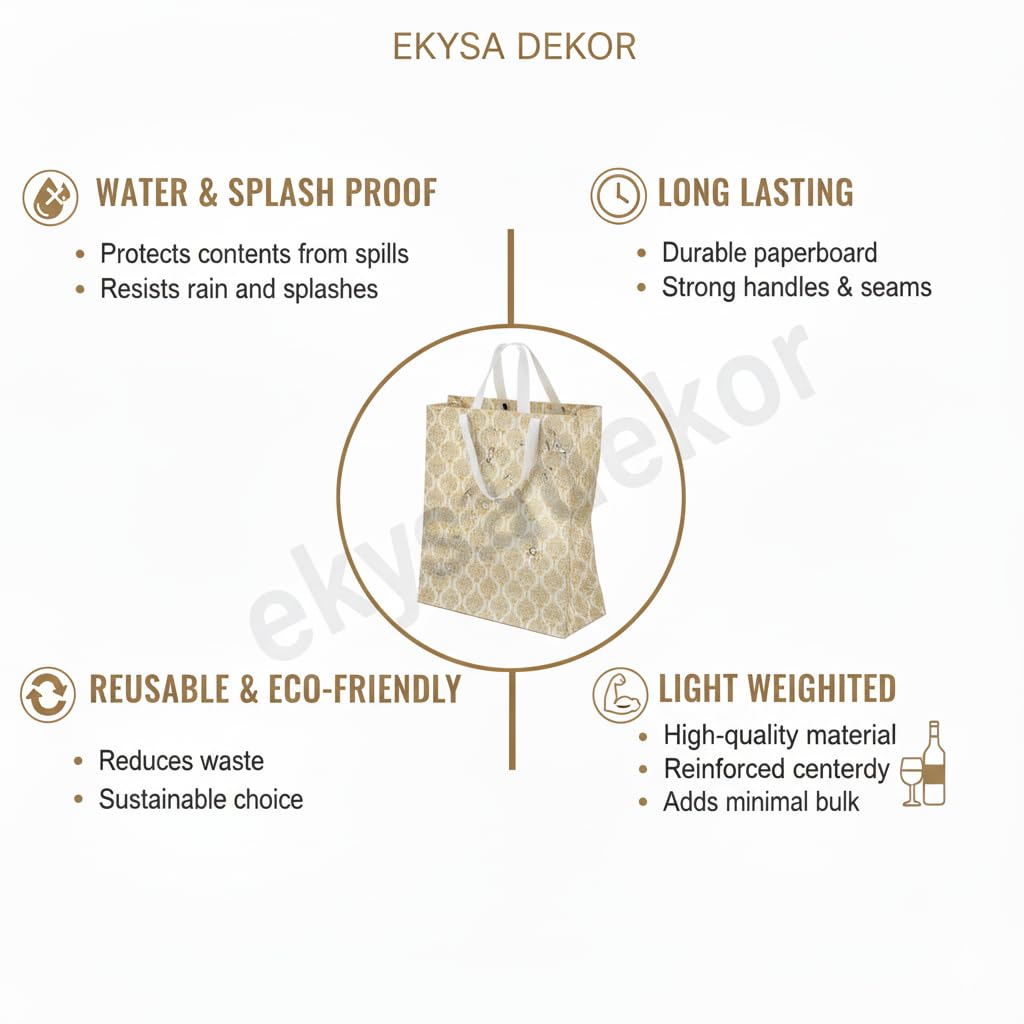 Elevate Your Gifting with the Elegance of a White Gold Damask Pattern Bag. Make every celebration unforgettable with our ekysa dekor Premium Gift Bags. Designed for those who appreciate the finer details, these bags feature a stunning Foil pattern set against a shimmering white backdrop. Whether you are hosting a grand wedding or a small festive gathering, these bags add a touch of royal luxury to your gifts. Wedding Favours: Jewellery boxes, sarees, and silver coins. Festive Hampers: Dry fruits, chocolates, and sweets. Party Giveaways: Cosmetics, perfumes, and return gifts for Baby Showers or Kitty Parties. Durability Meets Sophistication. Forget flimsy paper bags that tear under pressure. Our bags are crafted from high-quality, thick non-woven fabric laminated with an advanced laser coating. The reinforced handles ensure you can carry heavier items like MDF boxes or glass jars with total peace of mind. Plus, the water-resistant surface means your gifts stay protected from unexpected splashes or light rain. Sustainable & Eco-Conscious Choice Celebrate responsibly! Made from upgraded, eco-friendly, non-poisonous materials, our bags are designed to be reused time and time again. Unlike disposable packaging, these long-lasting fabric bags serve as a functional gift themselves, as guests can reuse them for shopping or storage, reducing environmental waste. A Bag for Every Indian Celebration from the vibrant colors of Holi and Mehendi to the sacred moments of Shagun and Diwali, these bags are versatile enough for all traditional Indian festivities including: Weddings: Haldi, Sangeet, and Reception Return Gifts. Festivals: Rakhi, Karwa Chauth, Christmas, and Eid. Corporate: Sophisticated gifting for clients and employees. Product Specifications: Material: Laminated Non-Woven Fabric (Glossy Finish) Features: Water-Resistant, Reinforced Handles, Eco-Friendly