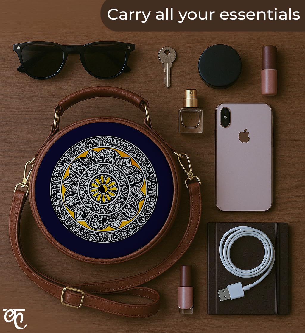 The Kalānkit Crossbody Round Sling Bag for women features a metallic zipper closure, ensuring the safety and security of your belongings. This chic round box sling bag features a robust handle that ensures a comfortable and secure grip, making it effortless to carry with confidence.