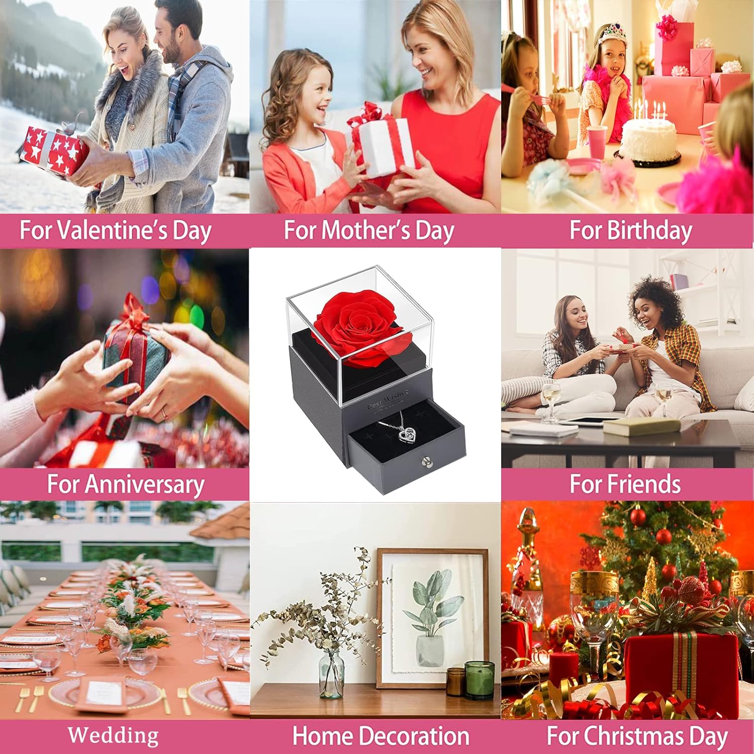 ?Luxury 5-in-1 Gift Pack?:The eternal rose flower gift set includes: 1 Red Rose + 1 Jewelry Box + 1 Heart Necklace + 1 Gift Bag + 1 Greeting Card. This complete set makes a beautiful luxury ready-to-give gift. Give the special one the eternal rose to convey your eternal feelings, and the exquisite necklace will add an element of surprise. Greeting card (You can fill in what you what say to her by yourself ). That’s so great!