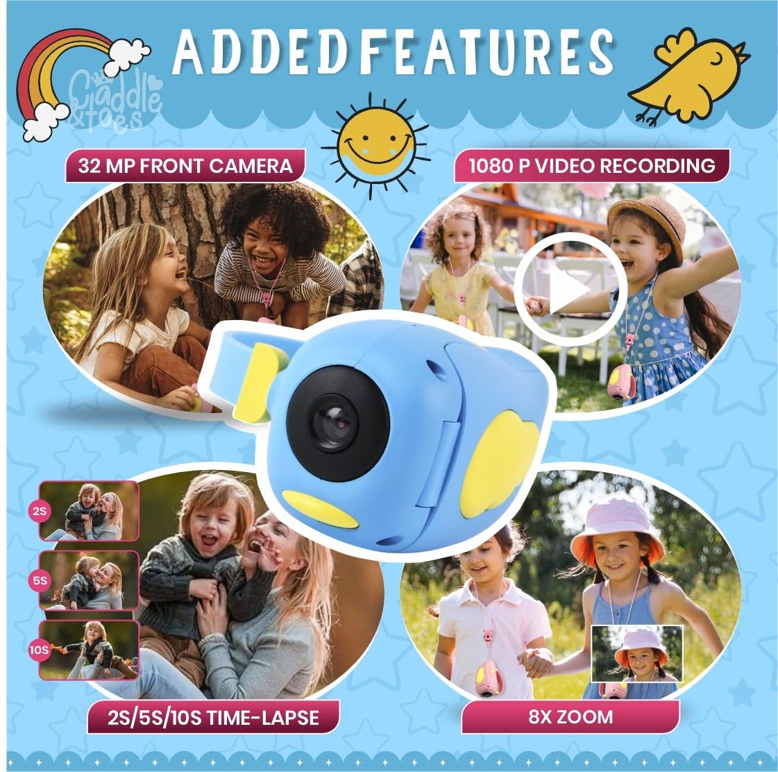 The body has a sleek design, and the grip is more comfortable to protect the child’s tender hands. Kids Camera with 1080P(1920×1080) HD video camcorder and 3.0 Mega Pixel, greatly improve the photos definition compared with other children cameras.