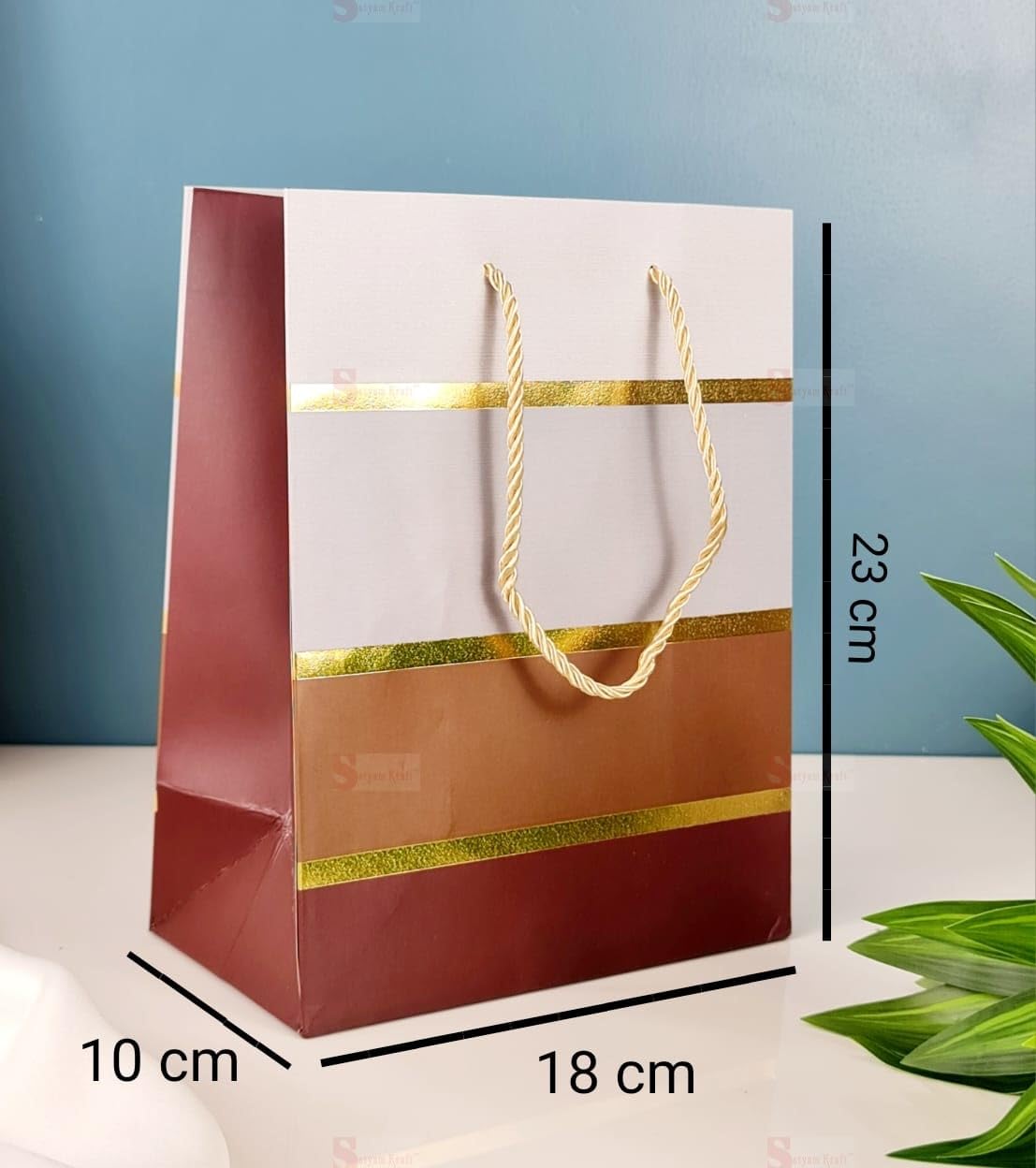 Package includes : 4 Pcs of paper bag , Size : 18 cm x 23 cm (L x H) , Colour : Multicolor , Material : Paper