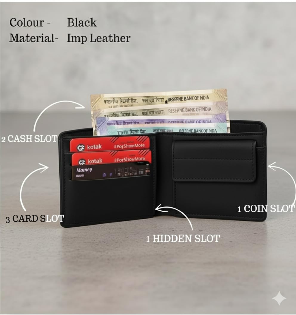 Functional Layout: Bifold design with multiple card slots, currency compartments