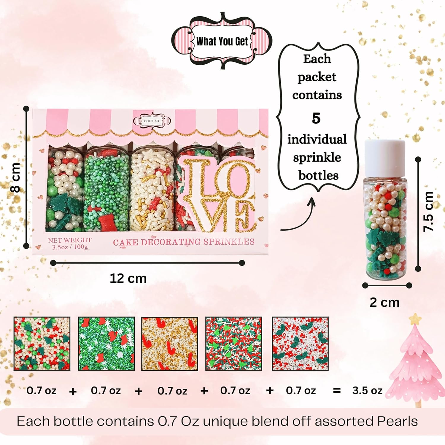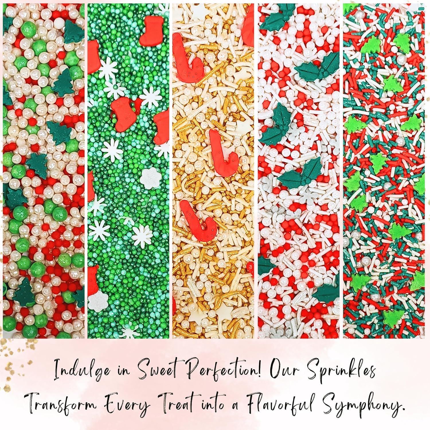 Christmas sprinkles come in a festive array of shapes, including classic holiday icons like snowflakes, Christmas trees, reindeer, and stars. They are often available in vibrant colors such as red, green, white, gold, and silver, making them perfect for decorating cookies, cupcakes, and other holiday treats.