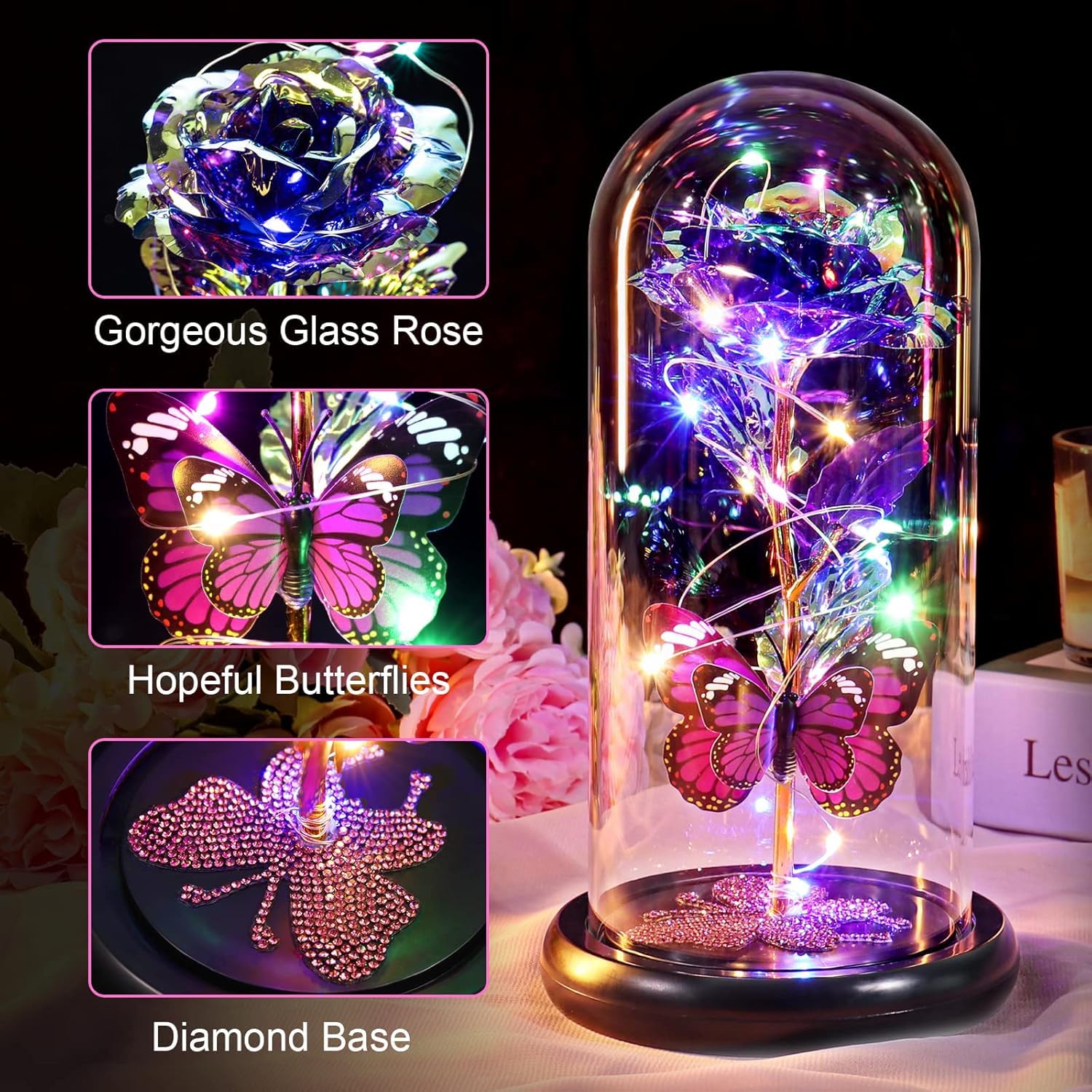 🌹Roses Gifts for Women: Galaxy Rose in Glass Dome Butterfly Flower Diamond Base. The Eternal Roses have always been a symbol of appreciation, best wishes, forever love, passionate and romantics.Each unique designed butterfly is different, special for her, for your special loved one, tug at her heartstrings!