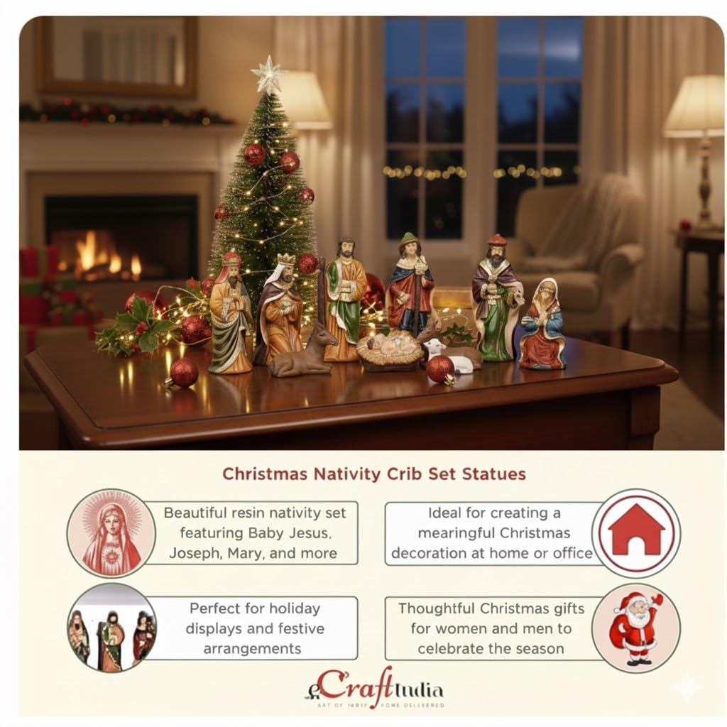 Capture the essence of Christmas with this exquisite Christmas Nativity Crib Set, crafted in resin to bring elegance and spirituality to your decor. Ideal as Christmas decorations items, it beautifully enhances any Christmas ornaments display and makes a timeless addition to your crib set for Christmas