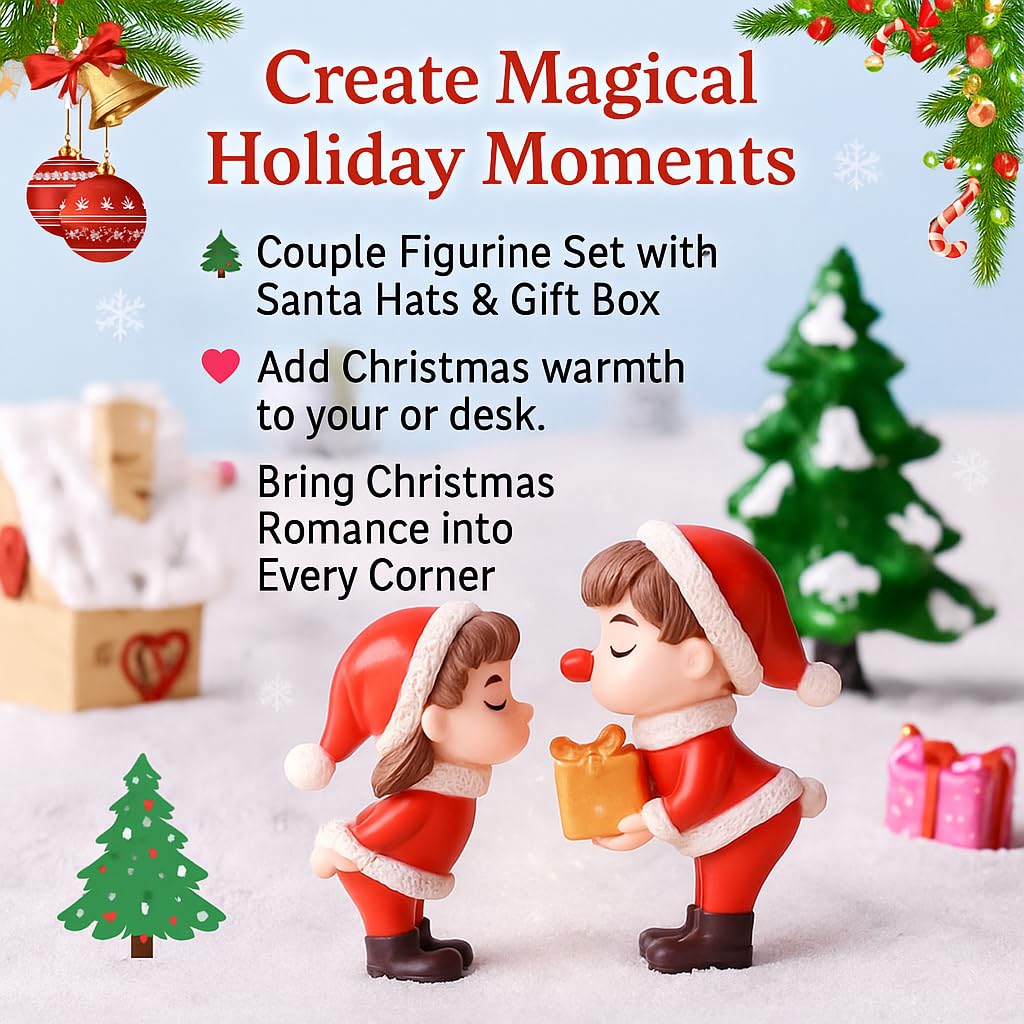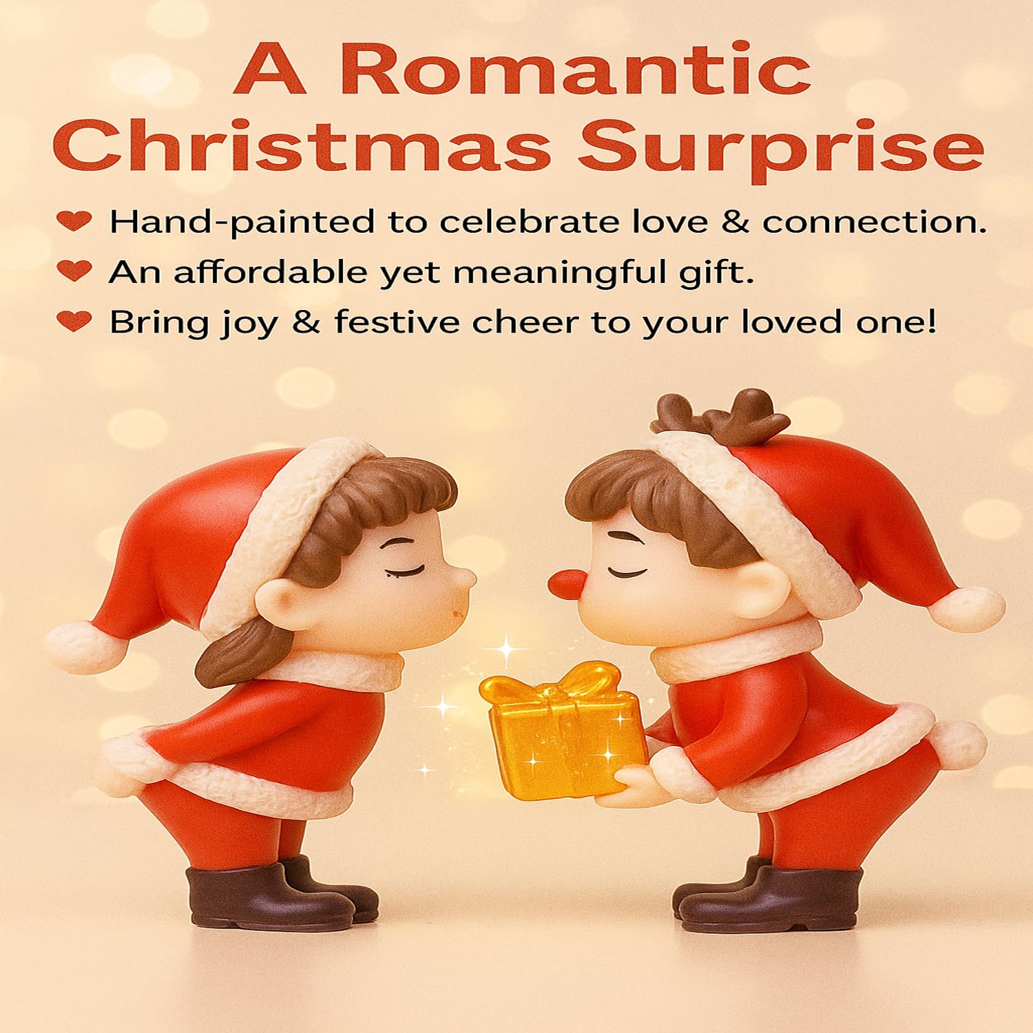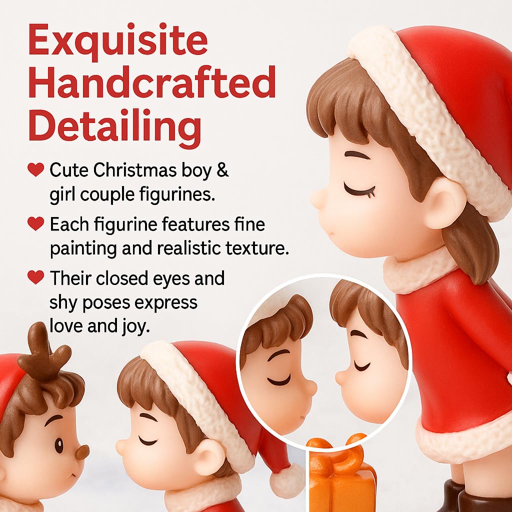 Each figure — a charming boy and girl dressed in festive Santa outfits — is meticulously hand-painted to capture a heartwarming moment of affection. The boy holds a tiny golden gift box while the girl leans in shyly, their closed eyes reflecting love and joy.