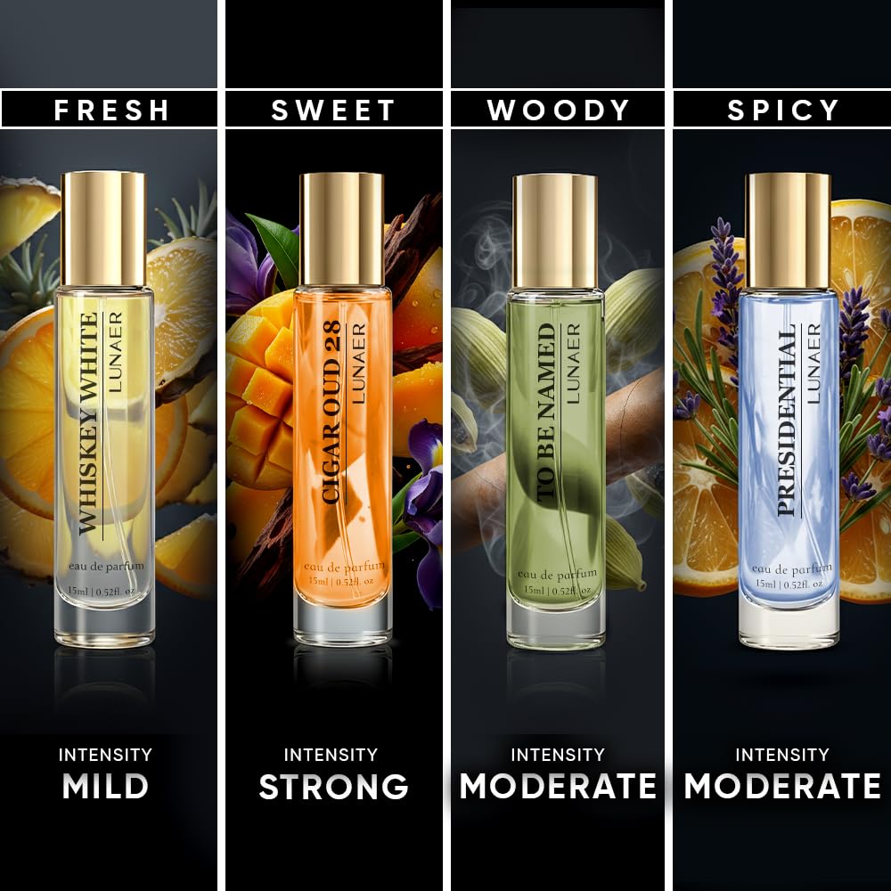 The Lunaer Men’s Perfume Gift Set is a curated collection of four distinct fragrances, each designed to highlight different facets of a man’s personality. – Presidential: A bold blend of bergamot, leather, vetiver, pepper, and warm woods with cacao—perfect for fueling motivation and success at work. – To Be Named: A versatile and captivating scent that invites you to define its essence, making it uniquely yours. – Whiskey White: A seductive mix of pineapple, apple, bergamot, black currant, lemon, patchouli, jasmine, cedarwood, and musk—ideal for boosting your confidence on date night. – Cigar Oud: A luxurious, masculine fragrance with bold notes that make a statement, embodying the essence of wealth and sophistication. This collection complements every aspect of your life, from professional achievements to romantic moments.