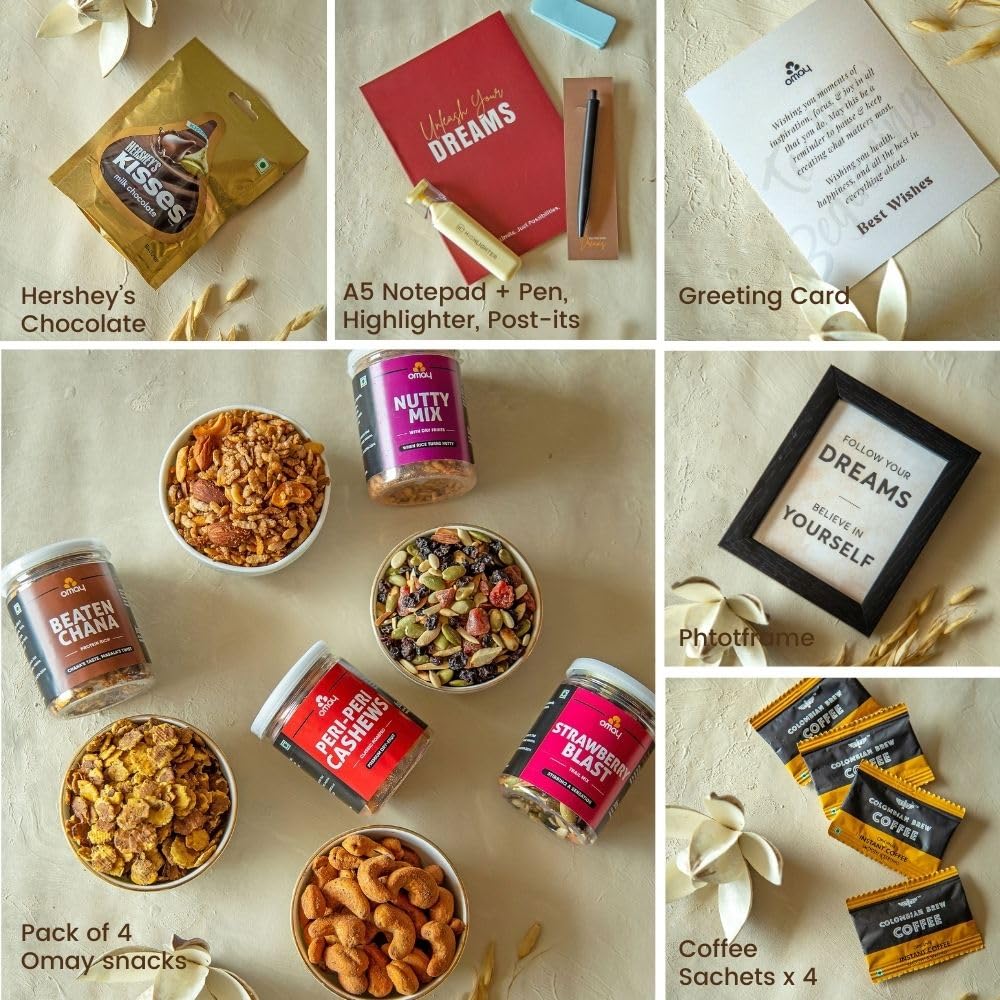 Package Includes: Peri Peri Cashews, 75g, Spiced Almonds, 80g, Berries Mix, 80g, Beaten Chana, 60g, Instant Coffee Sachets x 4, Custom Made Notepad + Pen, Highlighter x 1, Table Photoframe x 1, Post Its x 1, Hersheys Chocolate Pack x 1, in a premium Gift Box Packing