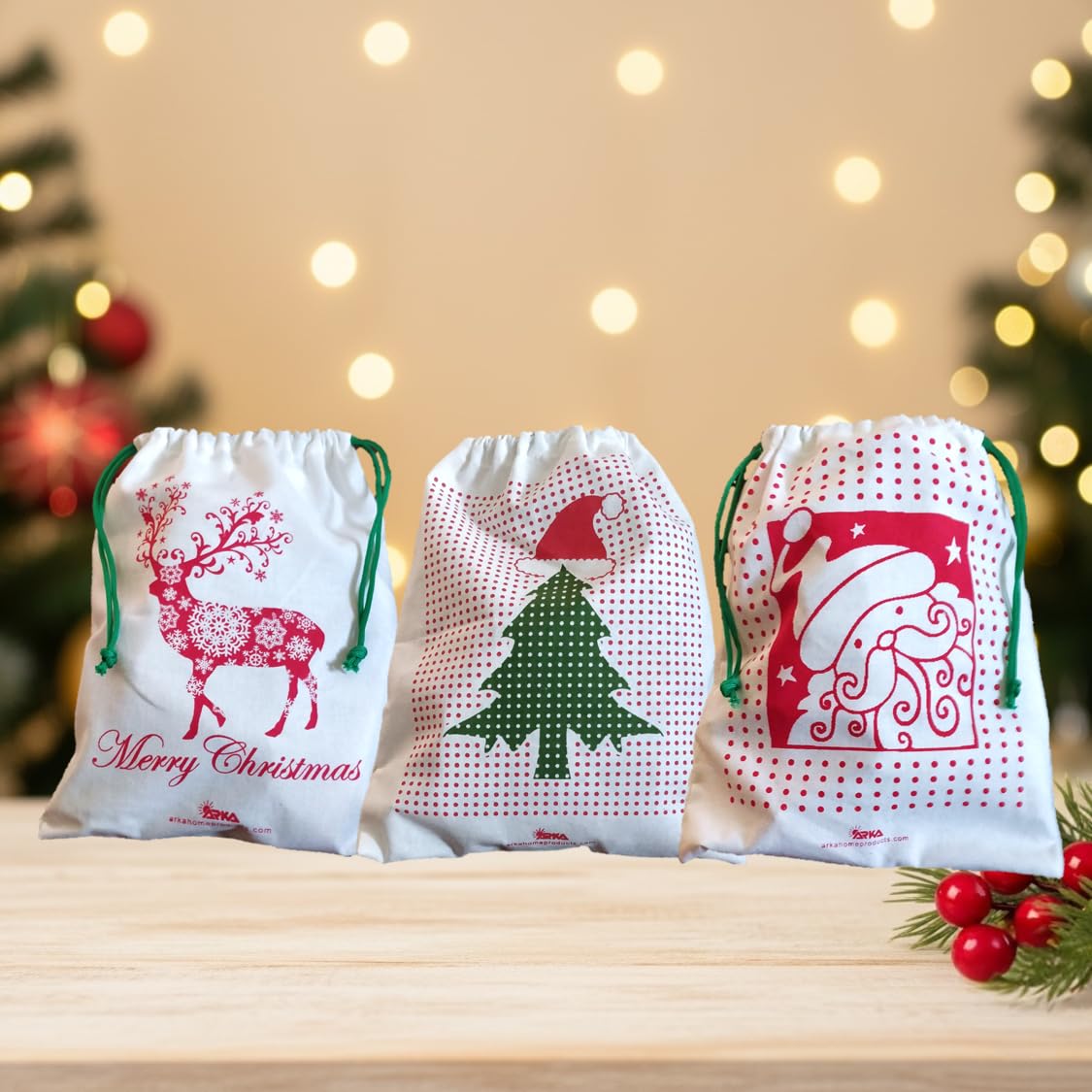 100% Cotton Drawstring Bags with beautiful Christmas-themed prints and Green strings.