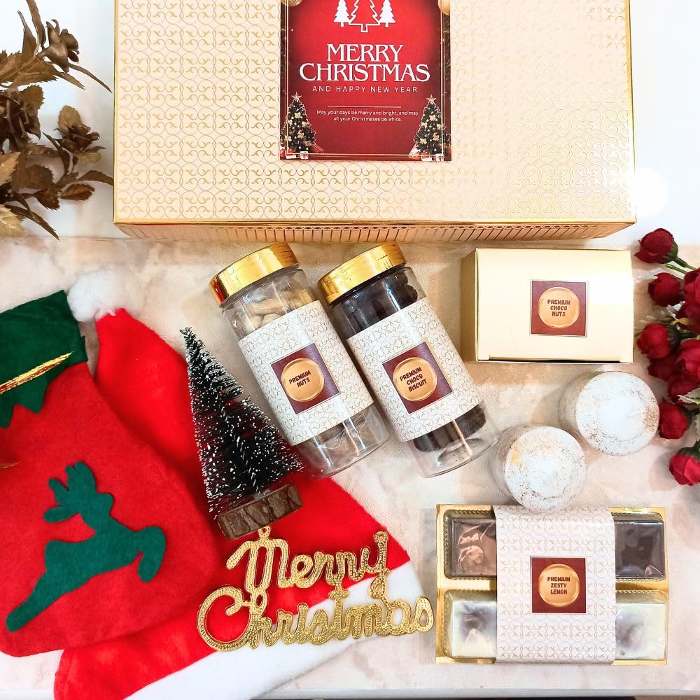 1. Roasted Salted Cashew 100g in a jar 2. Roasted Salted Almond 100g in jar 3. Dates almond ball 6- 7 pcs 100g in jar 4. Premium Chocolates with Nuts Zesty lemon & Coffee 8 pcs 5. Two pcs of Scented candles 6. one pcs of 20 cm christmas tree 7. one pcs of santa cap 8. one pcs of reindeer printd socks hanging 9. bubble ball for tree decortion golden color 1 pcs 10. one pcs of star golden decorative item 11. two pcs of gift box christmas tree decorative item 12. wood pine cone for christmas tree decoration 13. chistmas card on the top of the box
