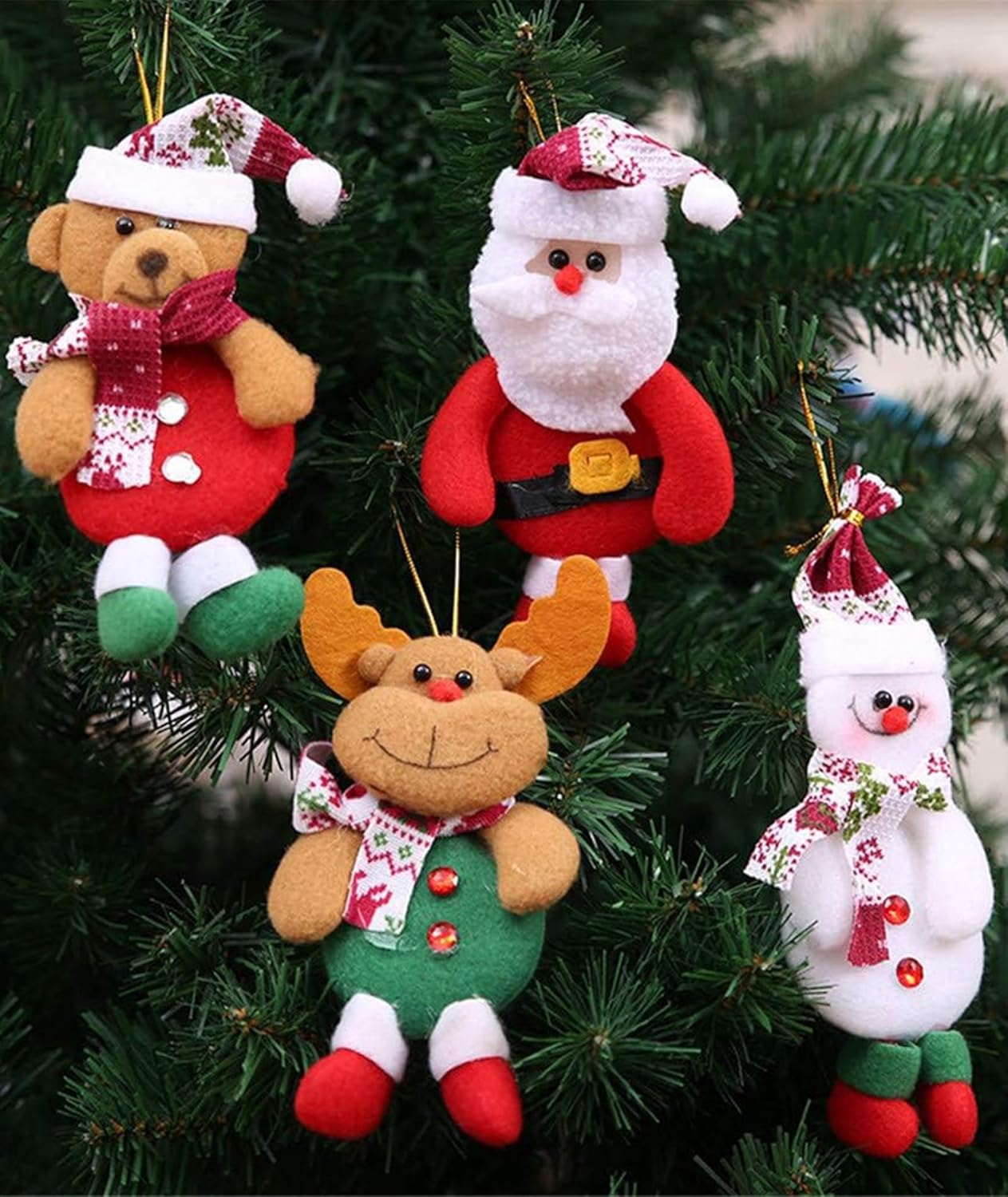Festive Christmas Decorations Set: This collection includes four charming hanging ornaments featuring Santa Claus, snowman, reindeer, and bear designs; Perfect for adding holiday spirit to your Christmas tree, doors, and windows
